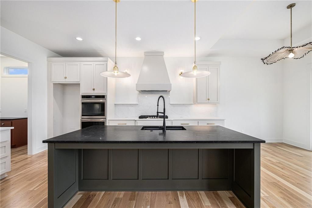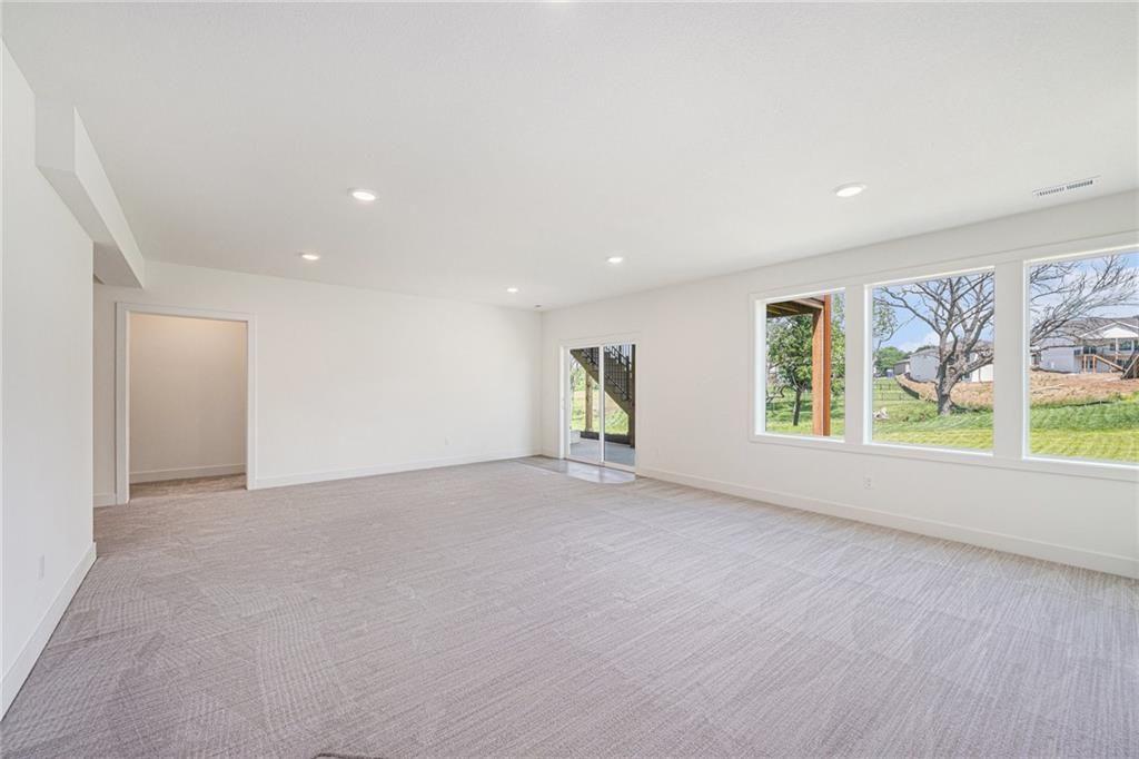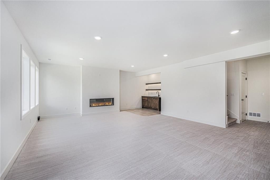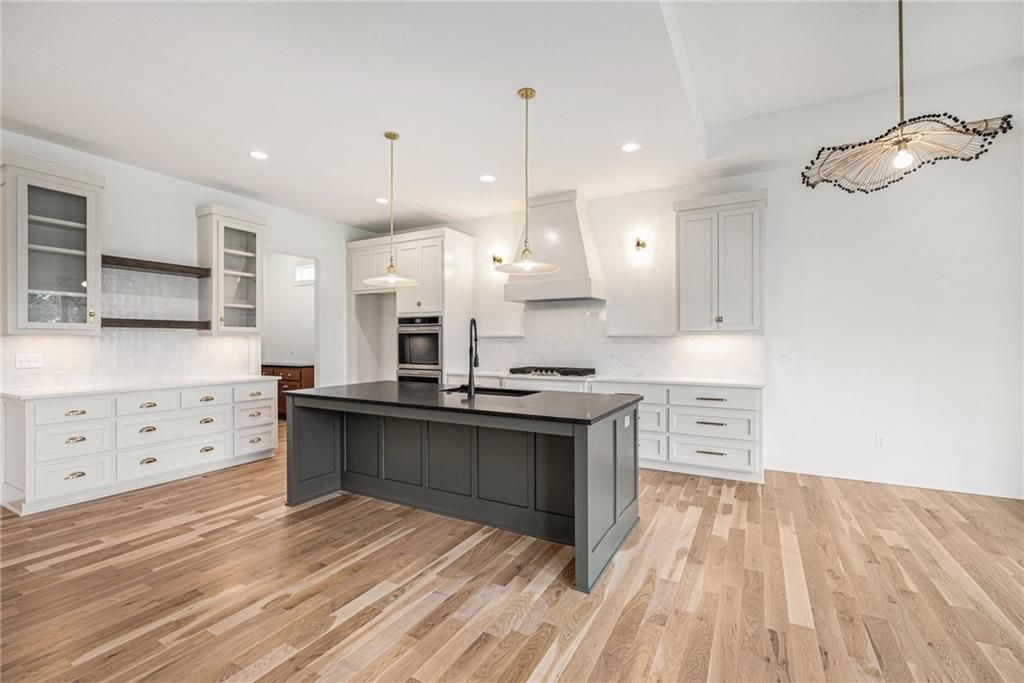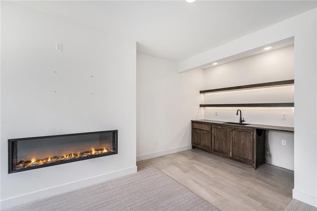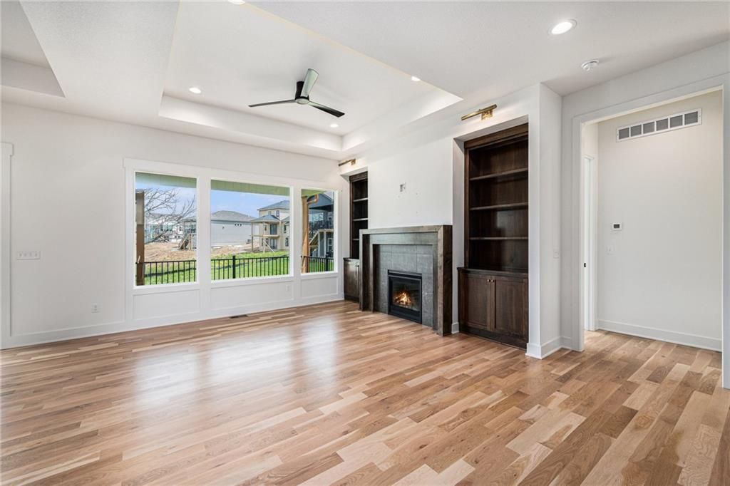 Custom 4 bedroom, 3 bath Fairfield reverse 1.5 story home built by Inspired Homes. Greeted into a foyer with tray ceilings. First bedroom and full bath at the front of home perfect for a guest space or home office. Flow into an open main level with 10 ft ceilings and 8 ft doorways. Upgraded kitchen with over-sized island, walk-in pantry, coffee bar, custom vent hood, quartz countertops & backsplash, Frigidaire gallery appliances including dishwasher, dual ovens, & 5 burner gas range. Home features an upgraded lighting and hardware package. Spacious living room w/ custom fireplace, & built-ins. Walk out to a 10x20 covered deck. Primary bedroom w/ walk-in closet & en-suite bath. Bath complete w/ tiled floors, zero entry walk-in shower, & dual vanities. Lower level hosts 2 bedrooms, full bathroom, family room, & wet bar. Contemporary exterior w/ white stone & copper gutters. White oak hardwood floors on main level. Neighborhood amenities include swimming pool, play area, & walking trail. Platte County School District.