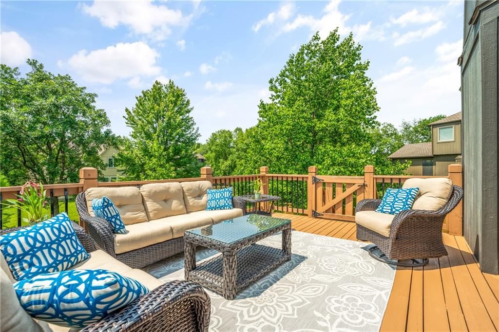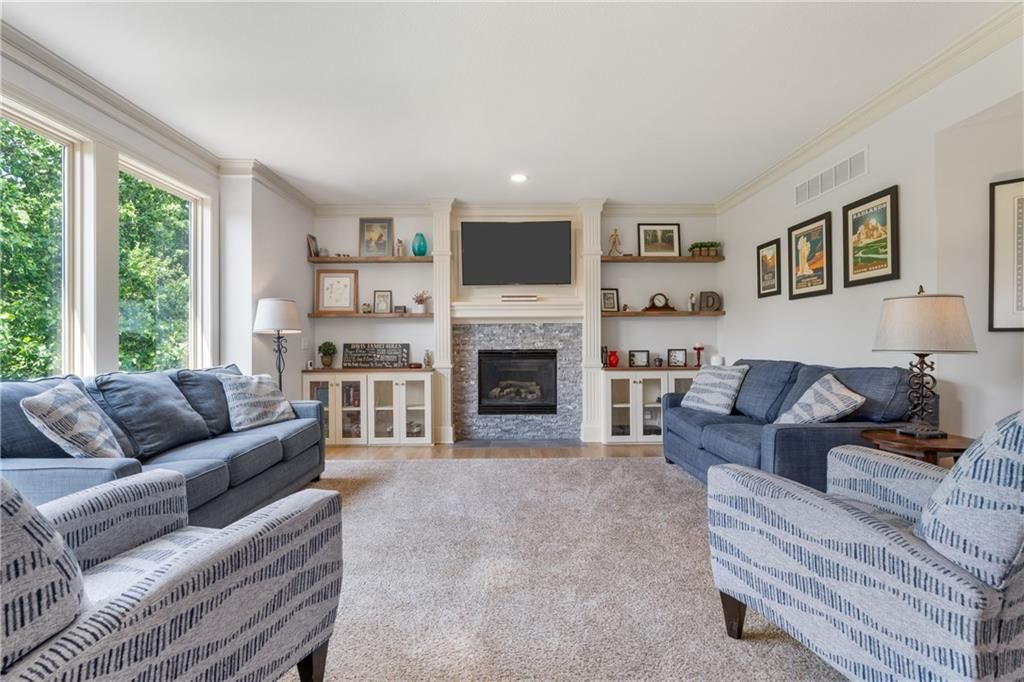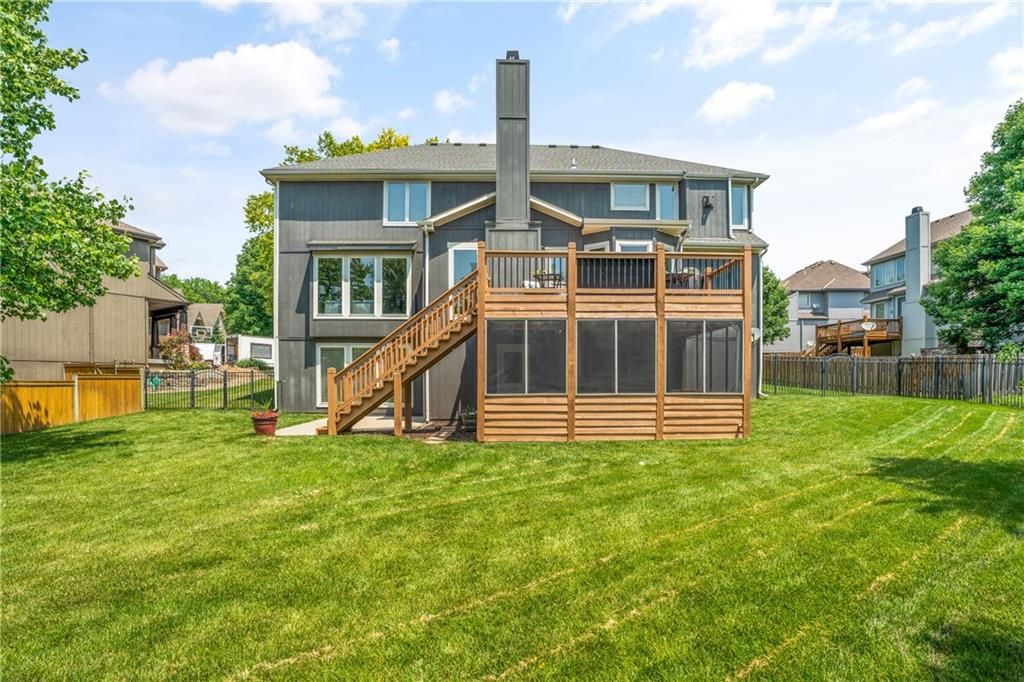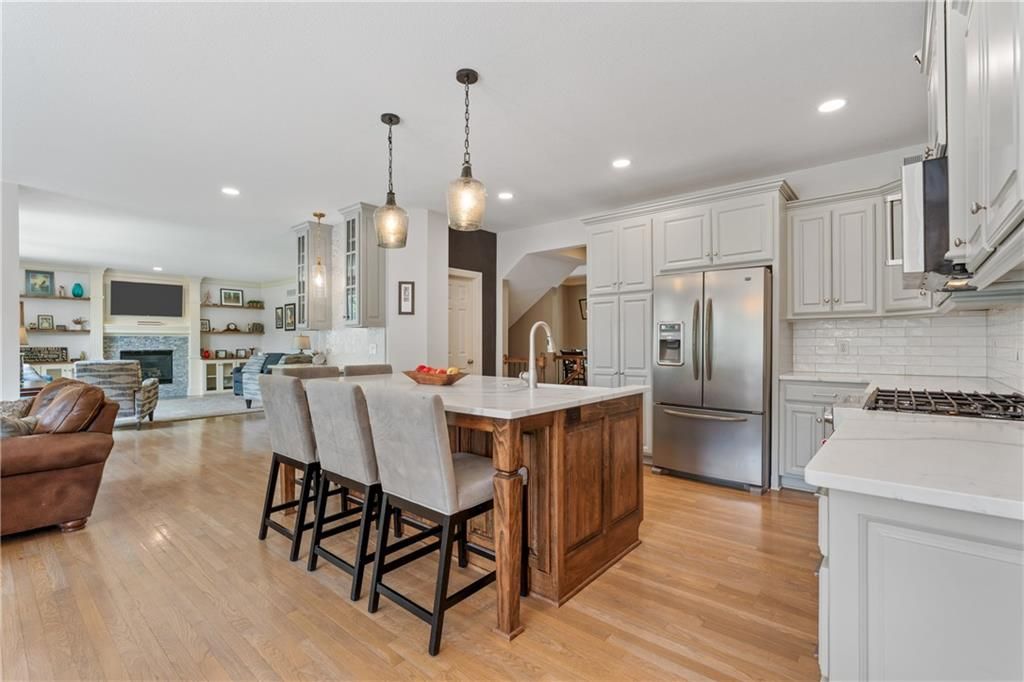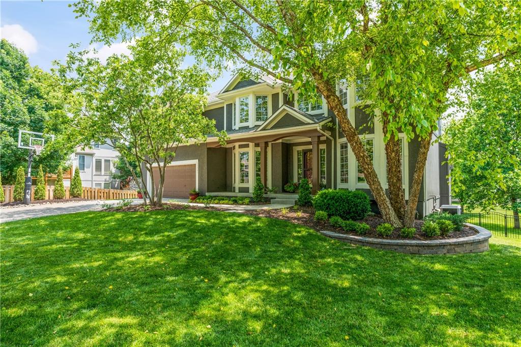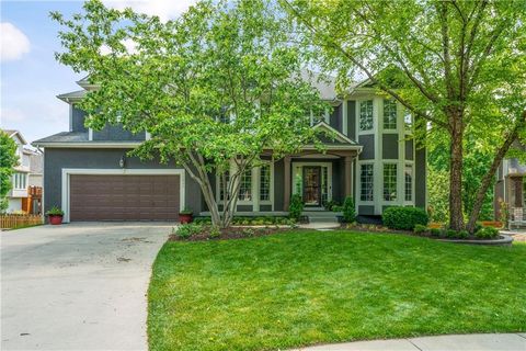 Welcome to this stunning entertainer's dream home nestled on a quiet cul-de-sac in the award-winning Blue Valley School District. Featuring a spacious open floor plan with seamless indoor-outdoor flow, this home has comfortably hosted large gatherings. The heart of the home is the 2022 kitchen, boasting a large 5-seat island with built-in standard, USB, and fast chargers - perfect for work or entertaining - plus a gas range, walk-in pantry, ample cabinetry, and an eat-in bay window nook. The adjacent drink bar features mosaic tile, accent lighting, and a built-in for two beverage refrigerators. Off the kitchen, a large hearth room with a stone fireplace offers cozy gathering space, while the living room includes custom built-ins and pre-wired hidden TV cabling. Formal dining with a butler's pantry and a front office both feature bay windows and glass-paneled doors. The luxurious primary suite includes dual closets, a fireplace, and a spa-like bath with an oversized walk-in tiled shower. Upstairs, the laundry room offers a sink and cabinetry. The finished, walk-out lower level offers a non-conforming 5th bedroom guest suite, large windows, surround sound, new paint, an office nook, and abundant storage. Outdoor living shines with a screened porch featuring stamped concrete, a built-in cooler system, and bar prep area, plus a refinished deck and fully fenced yard. A 3-car tandem garage includes workshop space. New front hardscaping (2025) adds curb appeal. Located in a welcoming community with no through traffic, and just minutes from shopping, dining, Black Bob Bay, and major highways - this home truly has it all.