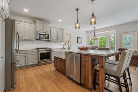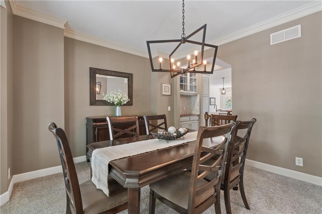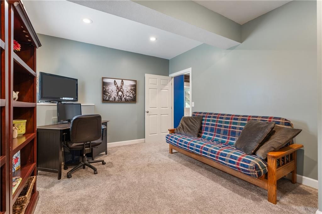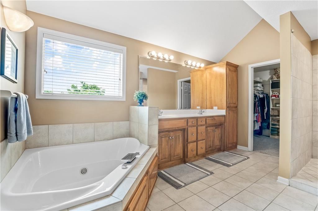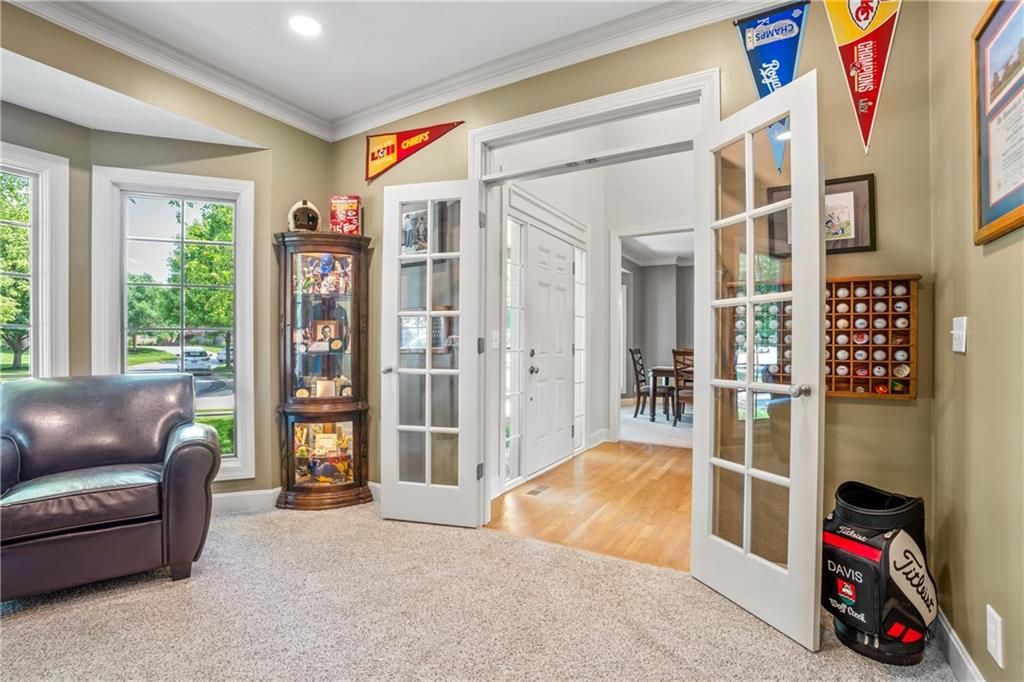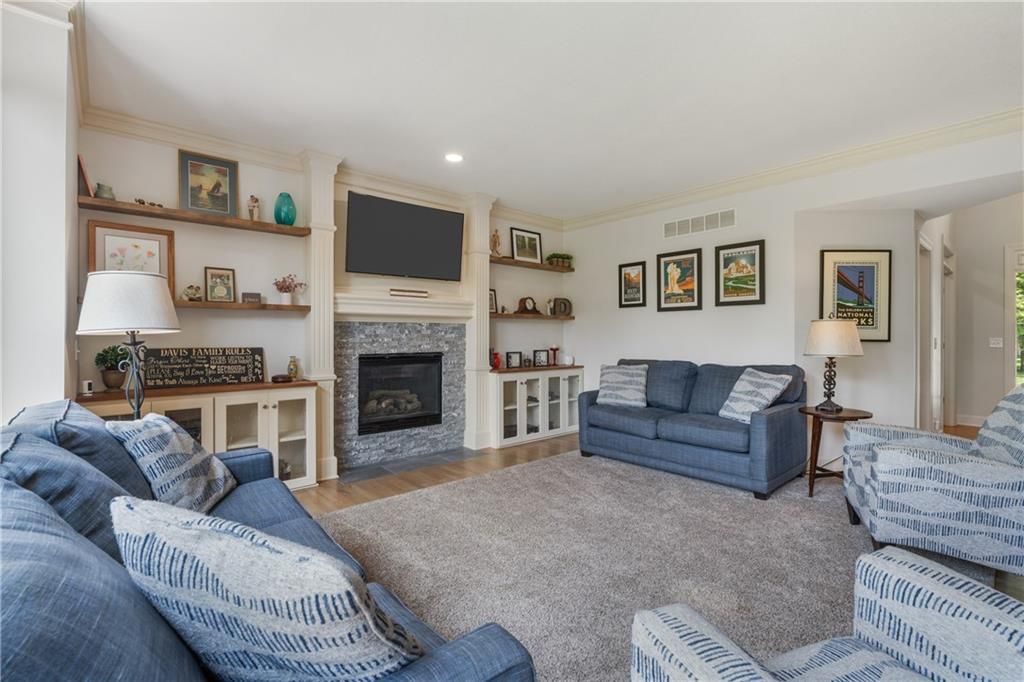 Welcome to this stunning entertainer's dream home nestled on a quiet cul-de-sac in the award-winning Blue Valley School District. Featuring a spacious open floor plan with seamless indoor-outdoor flow, this home has comfortably hosted large gatherings. The heart of the home is the 2022 kitchen, boasting a large 5-seat island with built-in standard, USB, and fast chargers - perfect for work or entertaining - plus a gas range, walk-in pantry, ample cabinetry, and an eat-in bay window nook. The adjacent drink bar features mosaic tile, accent lighting, and a built-in for two beverage refrigerators. Off the kitchen, a large hearth room with a stone fireplace offers cozy gathering space, while the living room includes custom built-ins and pre-wired hidden TV cabling. Formal dining with a butler's pantry and a front office both feature bay windows and glass-paneled doors. The luxurious primary suite includes dual closets, a fireplace, and a spa-like bath with an oversized walk-in tiled shower. Upstairs, the laundry room offers a sink and cabinetry. The finished, walk-out lower level offers a non-conforming 5th bedroom guest suite, large windows, surround sound, new paint, an office nook, and abundant storage. Outdoor living shines with a screened porch featuring stamped concrete, a built-in cooler system, and bar prep area, plus a refinished deck and fully fenced yard. A 3-car tandem garage includes workshop space. New front hardscaping (2025) adds curb appeal. Located in a welcoming community with no through traffic, and just minutes from shopping, dining, Black Bob Bay, and major highways - this home truly has it all.