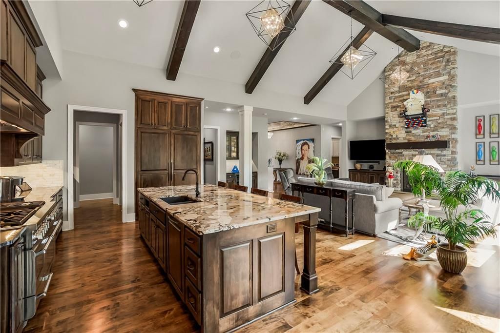 This fabulous custom home built by Starr Homes sits nestled on a wonderfully landscaped and private cul-de-sac lot in Leawood's highly sought Highlands Creek Subdivision. The open concept spacious main floor features vaulted ceilings, a cozy fireplace and gorgeous views of your private treed backyard. The kitchen features a stunning under-lit granite island, Thermador appliances and a large breakfast/dining area that opens to a fabulous lanai with built-in grill, fireplace and gas heater offering a wonderful extension of the indoors great for entertaining or just enjoying your private backyard. You'll find a fabulous primary suite on the main floor with a spa-like primary bath with large walk through double shower, adjacent laundry room and large walk-in closet. One additional bedroom on the main currently used as an office walks out to the lanai along with a large pantry, mud room and 1 1/2 additional baths can also be found on the main. The stunning lower level with 11' ceilings walks out to a spacious patio and features a full bar, wine cellar, rec/media room and 23x17 HD golf simulator. Three large bedrooms with private baths and plenty of storage space complete the lower level. This home has so much to offer with a 4-car side-entry garage with epoxy floors that is wired for an EV charger. At 5,848 finished sq ft and an overall sq ft of 7,869 and complete with an elevator and zero entry from the garage, this home truly offers something for everyone!