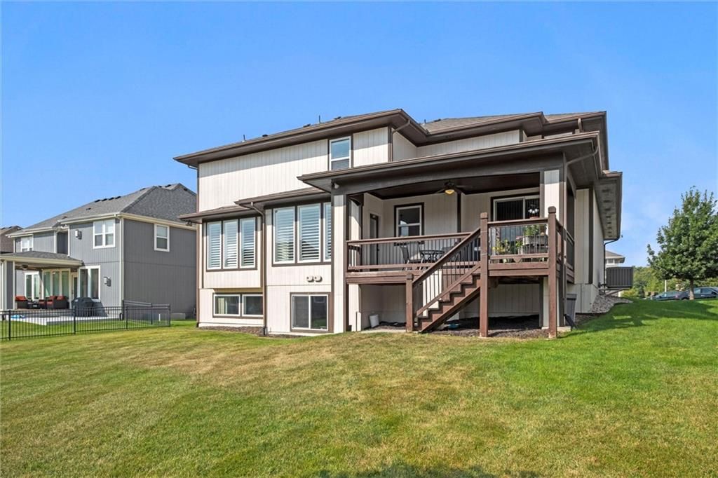 Welcome to the sought after, Wyngate Community! Discover refined living in this exquisitely designed 5-bedroom, 5.1-bath home, perfectly situated within the award-winning Blue Valley School District. Offering 4,328 square feet of living space, this home combines timeless craftsmanship with modern elegance. Step inside to find rich rustic oak floors leading to a gourmet chef's kitchen appointed with an oversized island, walk-in pantry, and professional-grade stainless steel appliances, including a gas range! The open concept design seamlessly integrates living and dining, with a main-floor bedroom or office provides exceptional flexibility. Upstairs, four spacious bedrooms each feature en-suite baths and walk-in closets. The primary suite is a private sanctuary with dual vanities, a spa-inspired soaking tub, and an expansive custom walk-in closet. The finished lower level extends the living space with a versatile recreation room, ready to be tailored to your lifestyle. Outdoors, a private deck overlooks the beautifully landscaped yard, ideal for both relaxation and entertaining. This home has been meticulously maintained and has a NEW ROOF! Resort-style community amenities include a clubhouse, a swimming pool, a 9.5-acre park, sport courts, and private trails connecting to neighborhood schools. With convenient access to premier shopping, dining, and major highways, this remarkable home truly offers it all.