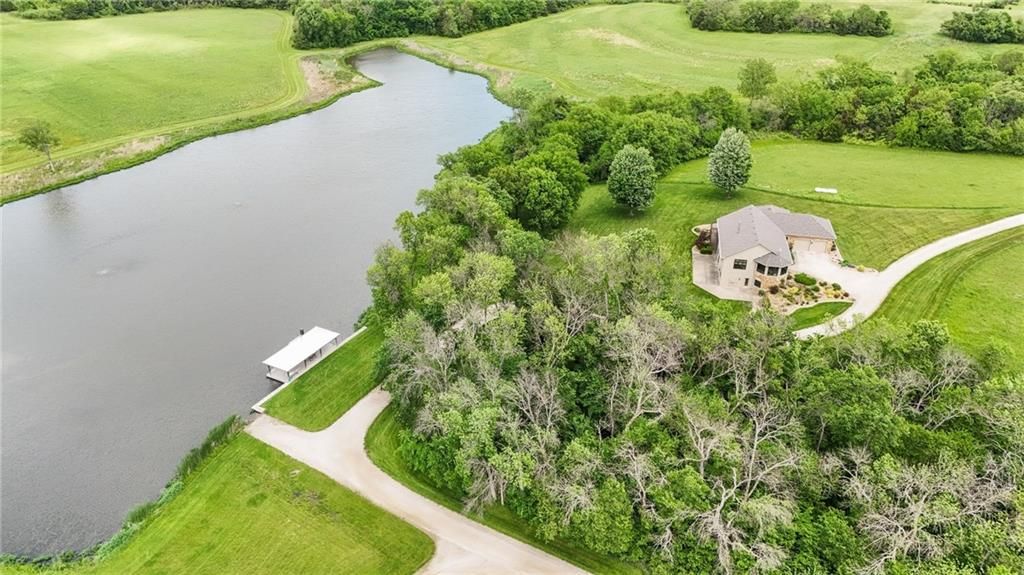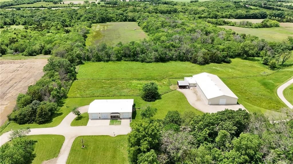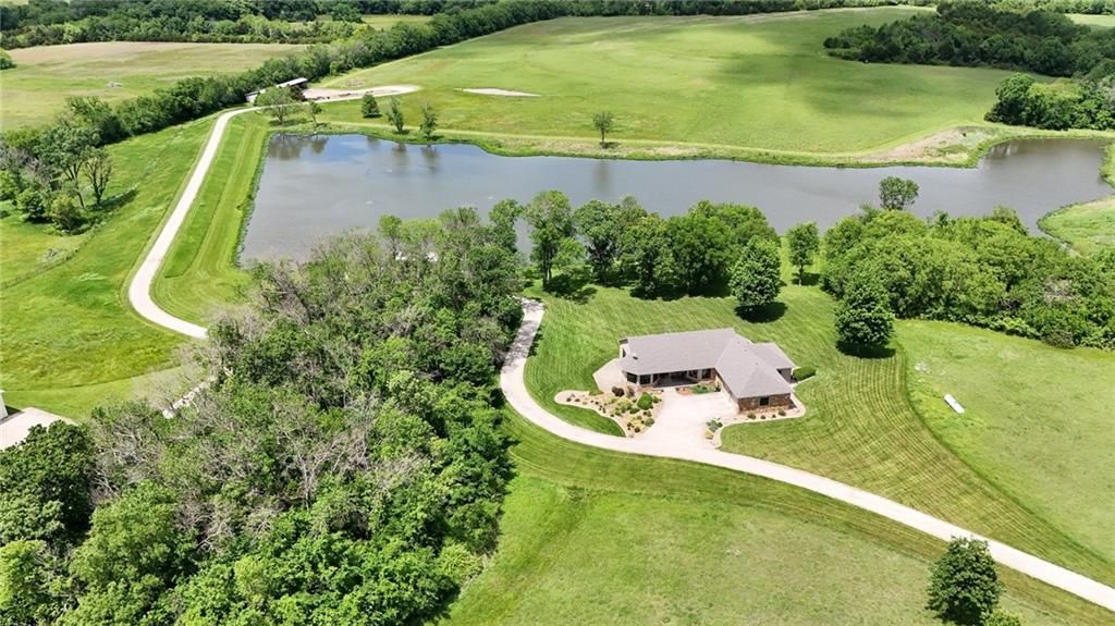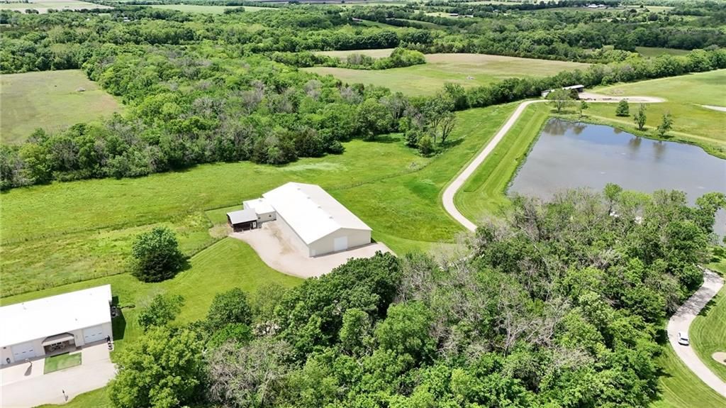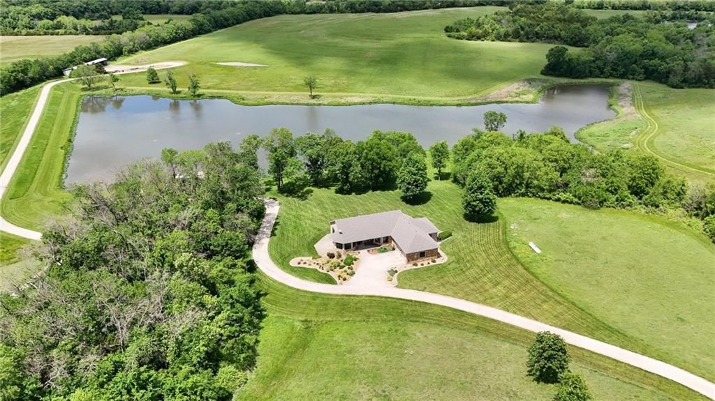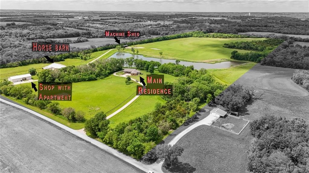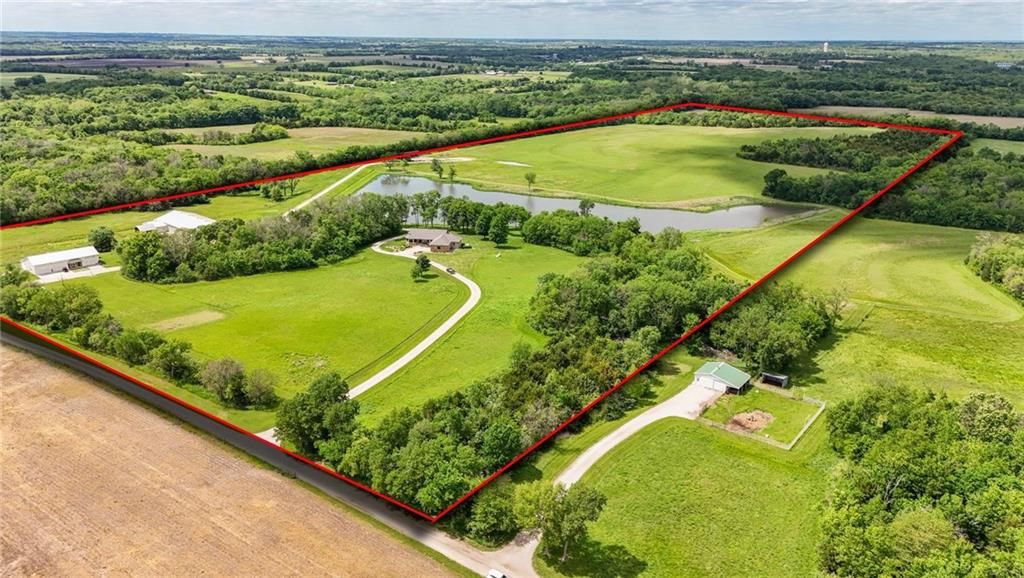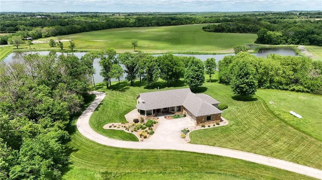 This Dream Homestead includes 80 Acres with Custom Home, Pond, Shop, ADU & Equestrian Facilities! Experience the ultimate rural retreat with this rare estate featuring a meticulously maintained, custom ranch home with walk-out basement, 7-acre stocked pond, 4800 SF workshop with apartment and equestrian amenities. Designed for comfort, self-sufficiency, and recreation, this property offers panoramic views and is located just a few miles south of Baldwin City with blacktop access and only 1/4-mile of rock road. Enjoy fishing, floating, or relaxing at the pondside covered dock, or explore trails perfect for hiking, riding, wildlife watching or hunting. The workshop is a dream setup for hobbyists and professionals alike and can accommodate guests in the 800 SF apartment. The indoor arena, stables, tack room, and pastures make it ideal for horse lovers. Whether you're homesteading, hosting guests, or seeking peace and tranquility, this one-of-a-kind property is a true lifestyle opportunity. Be sure to check out the video of the property and imagine yourself living the good life!