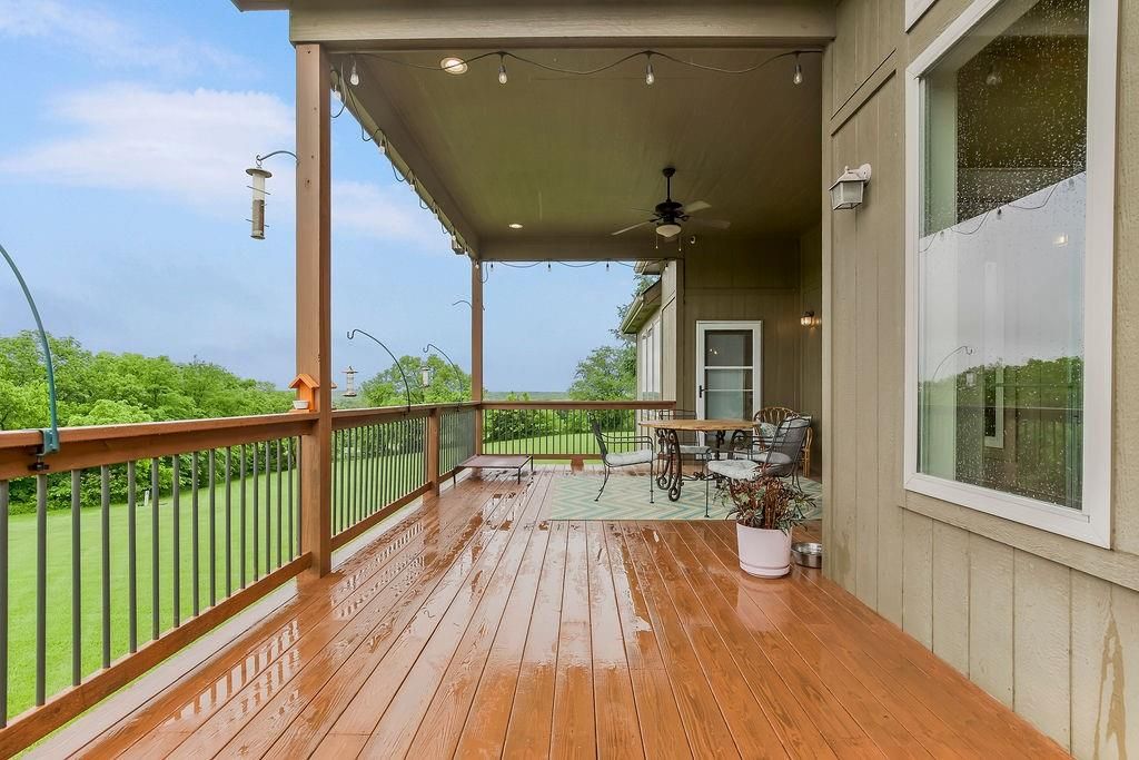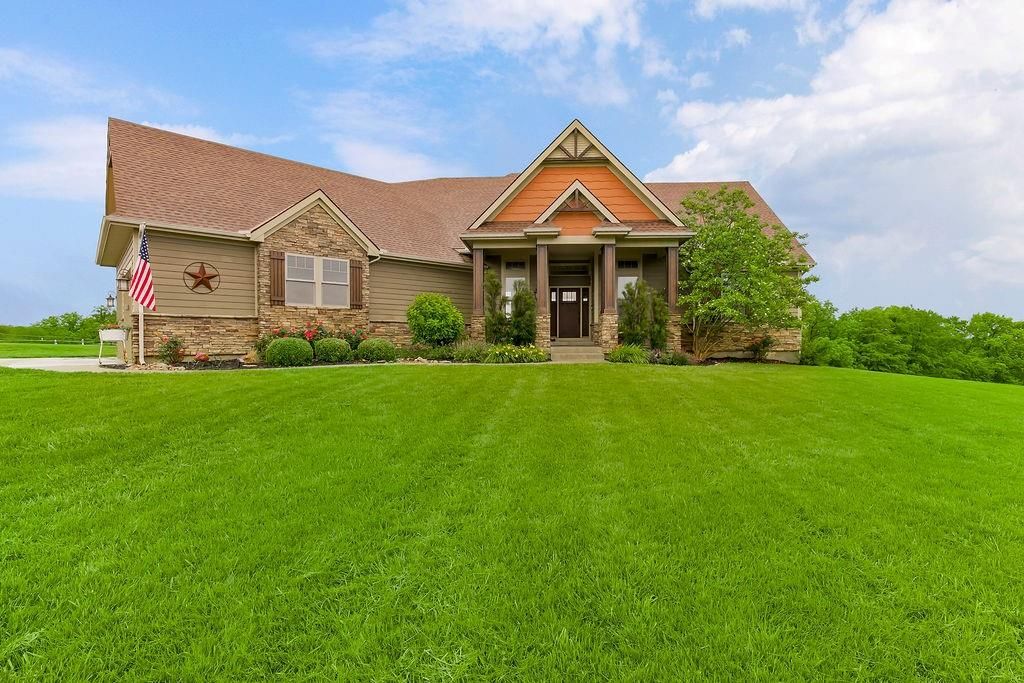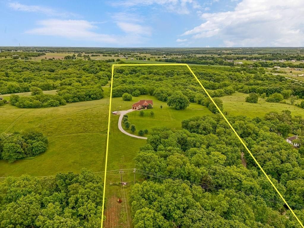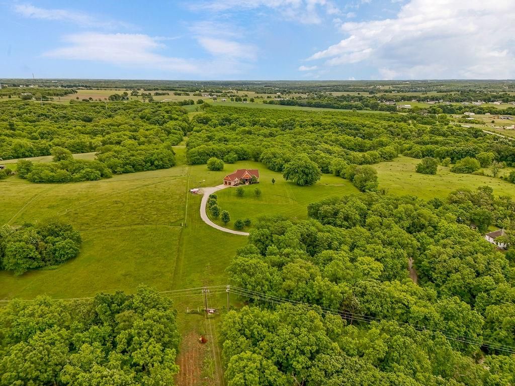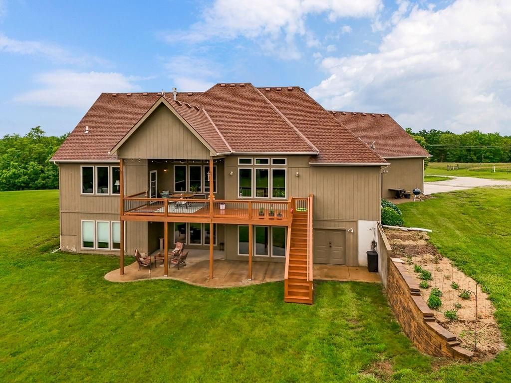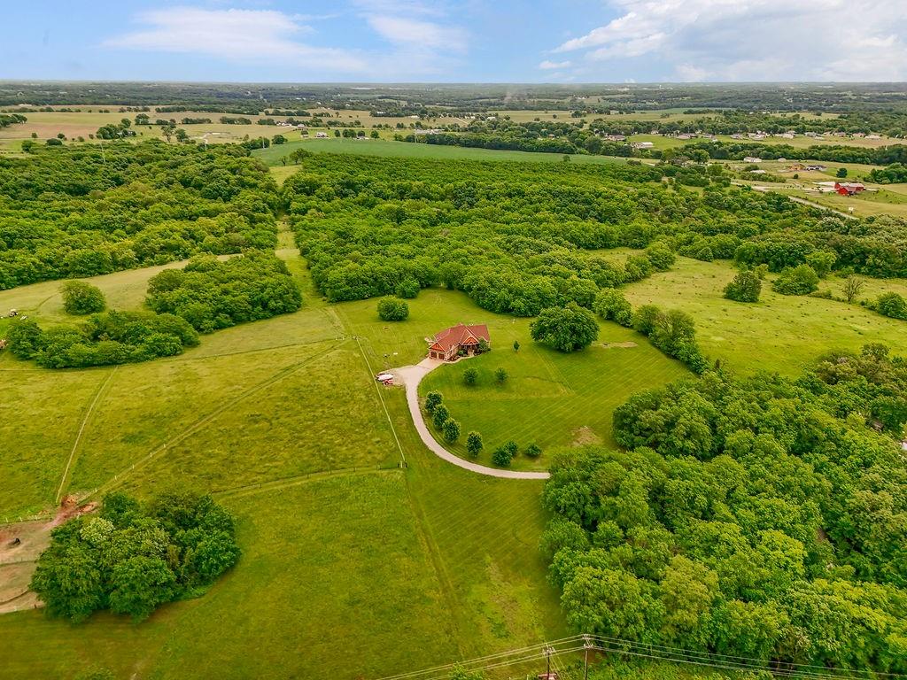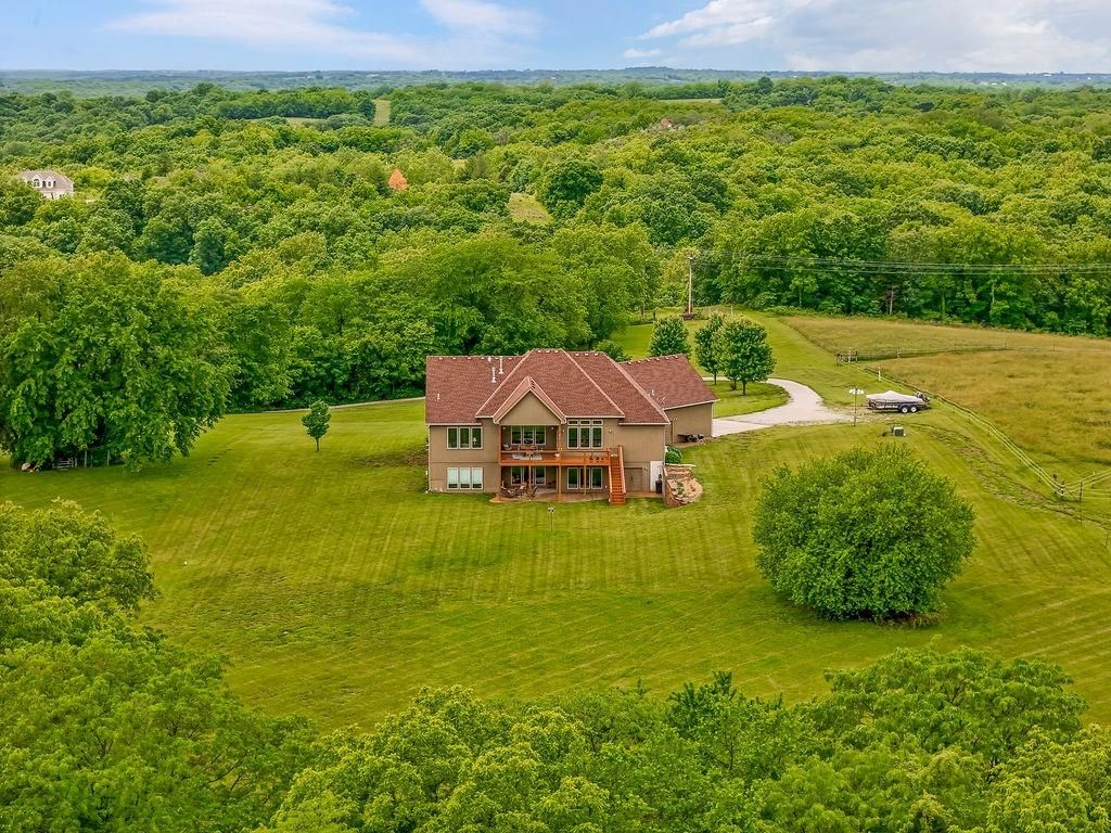 Hilltop Luxury Meets Peaceful Seclusion on 15+ Acres! Custom-built by Dean Ledford in 2015, this stunning reverse 1.5-story home sits atop a hill on 15.15 private acres, offering unmatched views, tranquility, and natural beauty just minutes from Smithville. A winding driveway welcomes you home, setting the stage for a retreat surrounded by green space, wildlife, and serene sunsets. Crafted with high-quality 2x6 construction and energy-efficient geothermal HVAC, this 5-bedroom, 3-bath home offers low utility costs and low taxes - without sacrificing modern comfort. The stone-accented exterior and columned front porch provide timeless curb appeal, while hardwood floors flow throughout the open-concept interior. Soaring ceilings and oversized picture windows flood the space with natural light and frame the scenic surroundings. The main level features two spacious bedrooms plus an office (optional third bedroom), including a luxurious primary suite with a tray ceiling, large windows, a walk-in closet, and a spa-like bathroom with a double vanity and walk-in shower. The heart of the home is the gourmet kitchen, equipped with an induction cooktop, built-in convection oven and microwave, walk-in pantry, and an oversized island with breakfast bar - all open to the cozy living room with a stone gas fireplace and the sunlit dining area with access to the covered deck. Downstairs, the walk-out lower level is perfect for entertaining or multi-generational living, complete with a second stone fireplace, wet bar, large family room, two generous bedrooms, and a full bath. Step outside to enjoy the peaceful covered patio and expansive backyard. All of this is located just 7 miles from Smithville Lake and 10 miles from KCI Airport - close enough for convenience, yet worlds away in terms of peace and privacy!