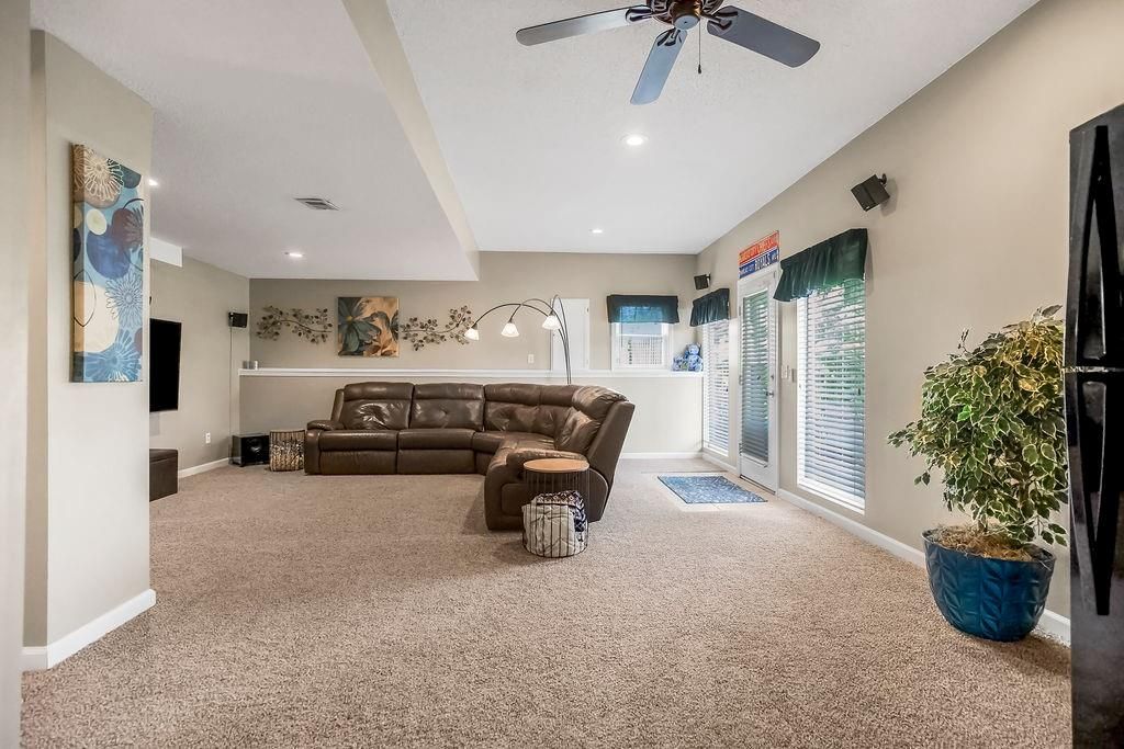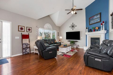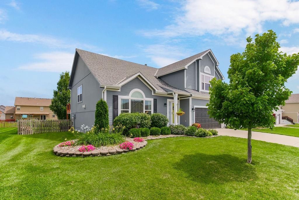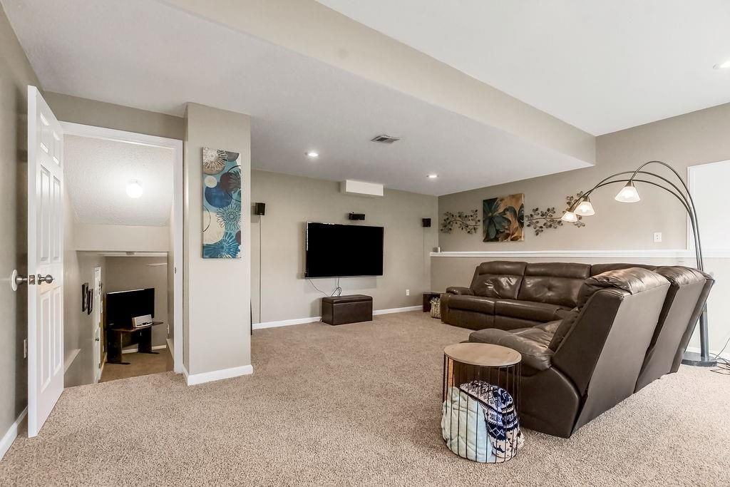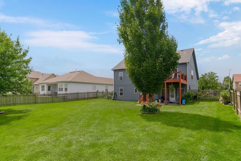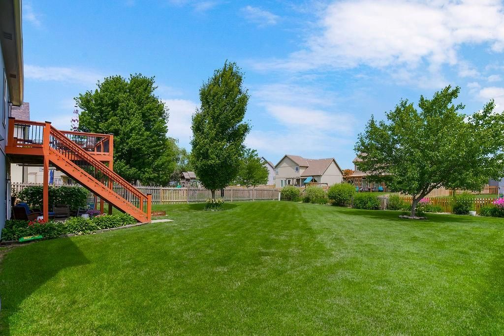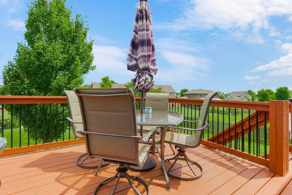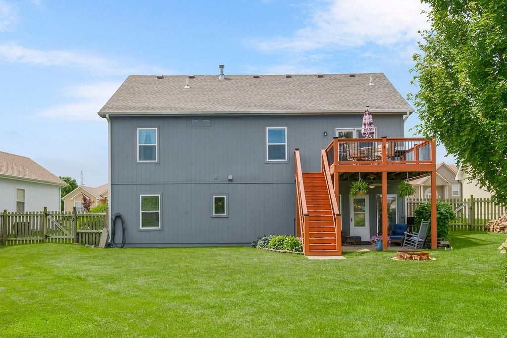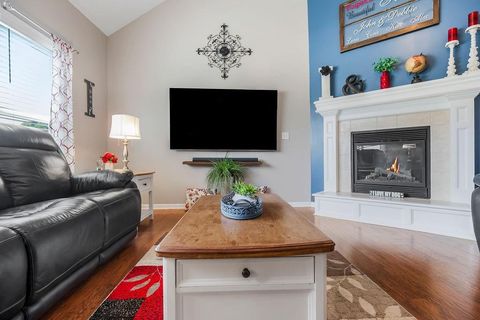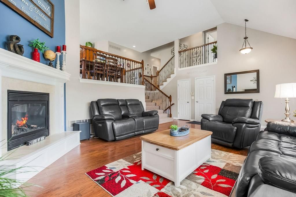 Welcome to your dream home with soaring ceilings and space to spare! Step inside to a grand, light-filled living room featuring a corner gas fireplace with a custom surround - perfect for cozy evenings. The open-concept kitchen and dining area is a chef's delight with granite countertops, pendant lighting, a spacious pantry, and ample cabinet storage. Just off the dining area, step out onto an amazing deck - ideal for morning coffee or summer barbecues. The vaulted primary suite is a true retreat, complete with a walk-in closet and spa-like bath featuring tiled floors, a jetted tub, and a tiled shower with 2 heads, 1 is a rain shower head! A stylish barn door adds just the right touch of charm! You'll love the fresh new carpet throughout, adding comfort and a move-in-ready feel. Head to the finished walkout lower level where you'll find a large family room perfect for movie nights or entertaining, plus a guest bedroom, a third full bath, and the 5th bedroom or bonus room - ideal for a home gym, office, or hobby space. Outside, enjoy the beautifully landscaped and fenced backyard from your covered patio with a ceiling fan to keep cool on warm summer nights. All of this, plus just a short walk to the neighborhood pool - this home has it all!