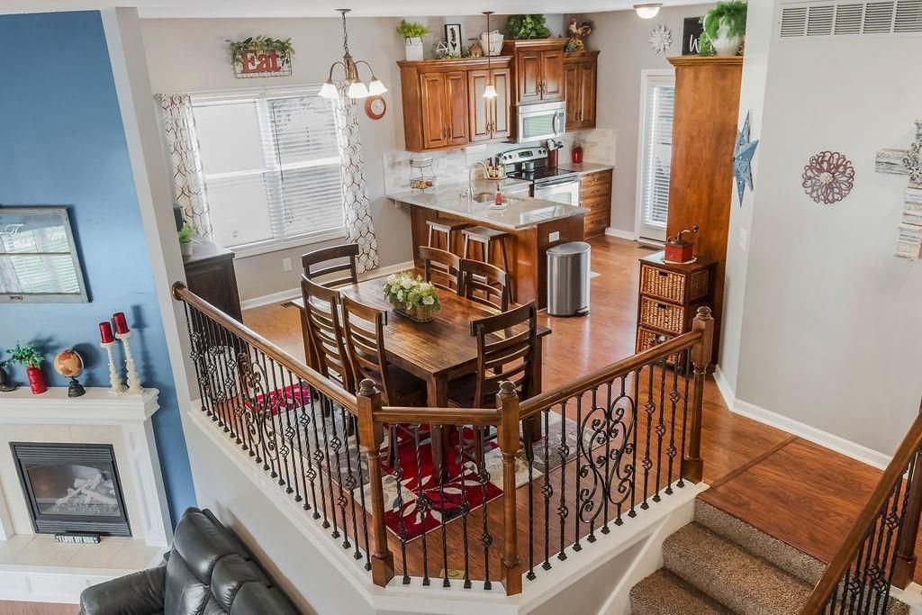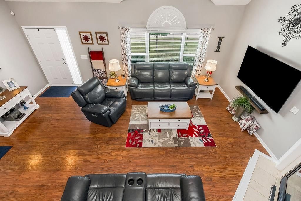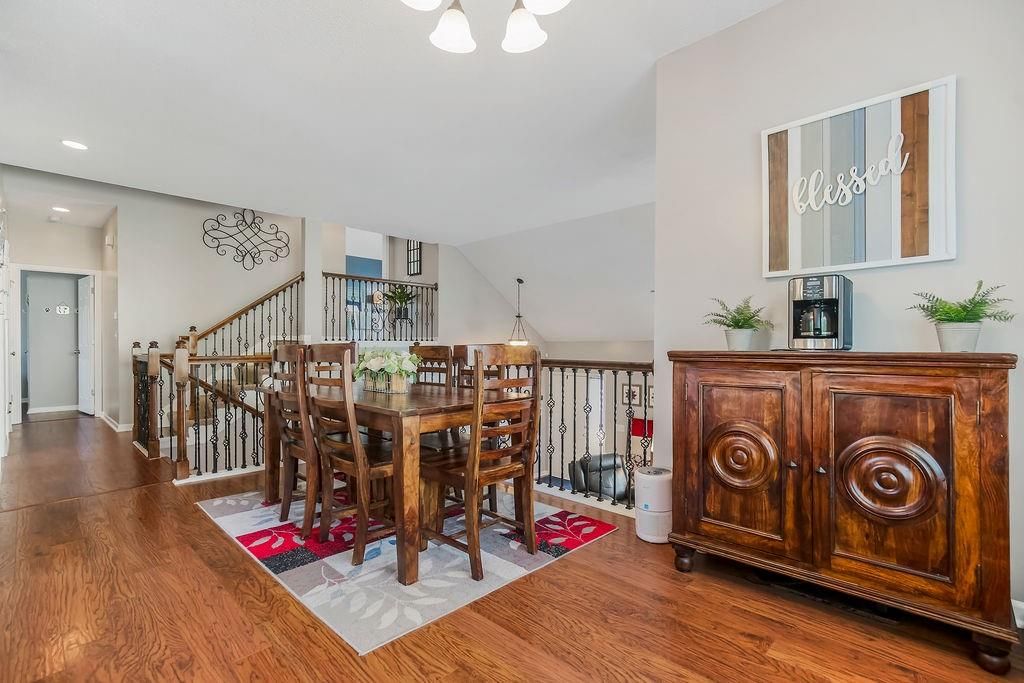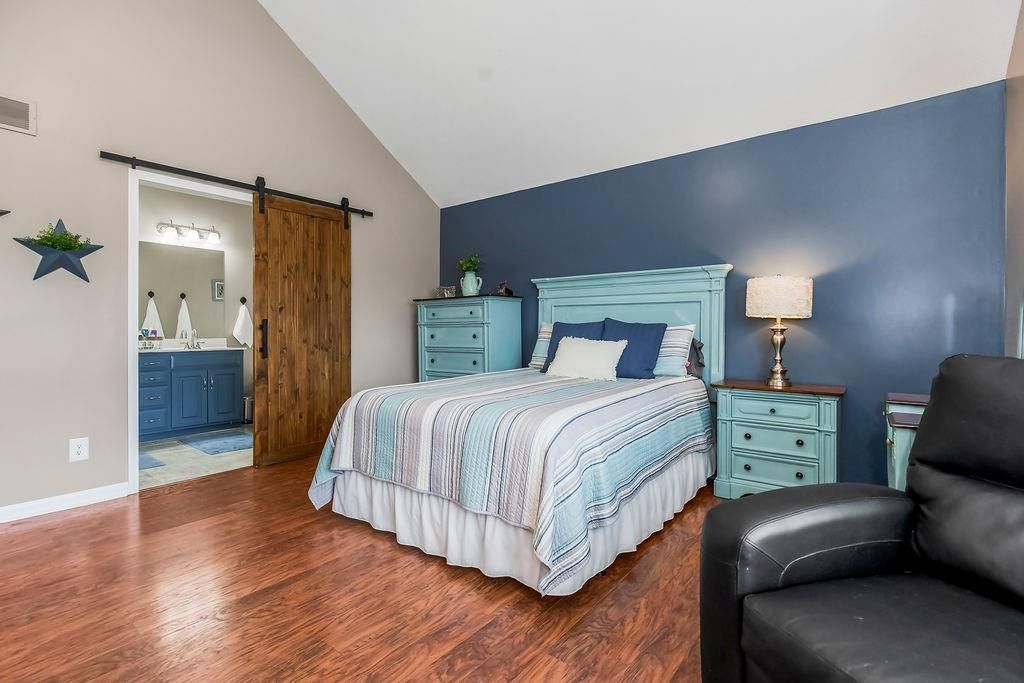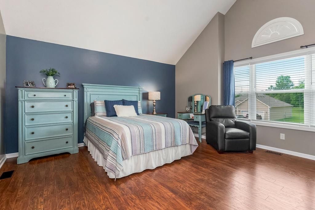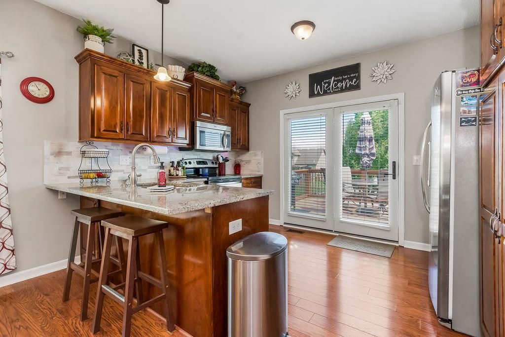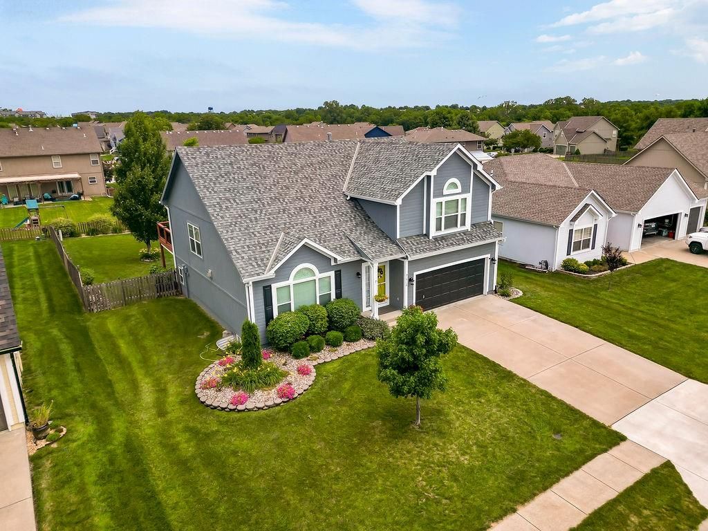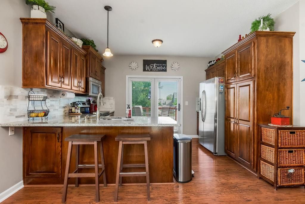 Welcome to your dream home with soaring ceilings and space to spare! Step inside to a grand, light-filled living room featuring a corner gas fireplace with a custom surround - perfect for cozy evenings. The open-concept kitchen and dining area is a chef's delight with granite countertops, pendant lighting, a spacious pantry, and ample cabinet storage. Just off the dining area, step out onto an amazing deck - ideal for morning coffee or summer barbecues. The vaulted primary suite is a true retreat, complete with a walk-in closet and spa-like bath featuring tiled floors, a jetted tub, and a tiled shower with 2 heads, 1 is a rain shower head! A stylish barn door adds just the right touch of charm! You'll love the fresh new carpet throughout, adding comfort and a move-in-ready feel. Head to the finished walkout lower level where you'll find a large family room perfect for movie nights or entertaining, plus a guest bedroom, a third full bath, and the 5th bedroom or bonus room - ideal for a home gym, office, or hobby space. Outside, enjoy the beautifully landscaped and fenced backyard from your covered patio with a ceiling fan to keep cool on warm summer nights. All of this, plus just a short walk to the neighborhood pool - this home has it all!
