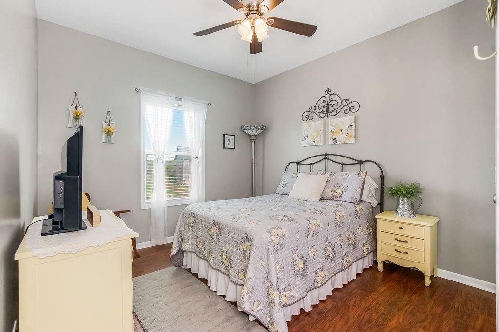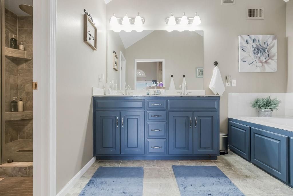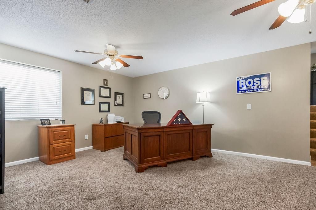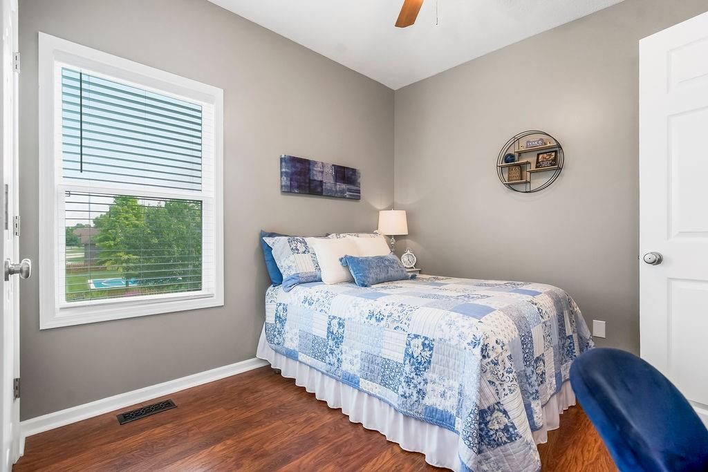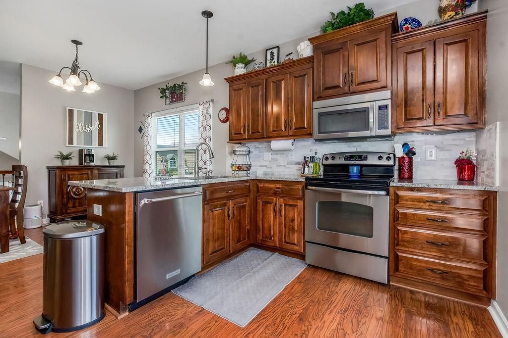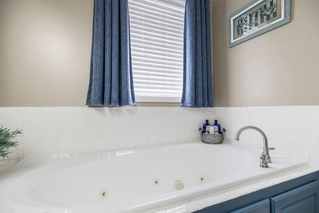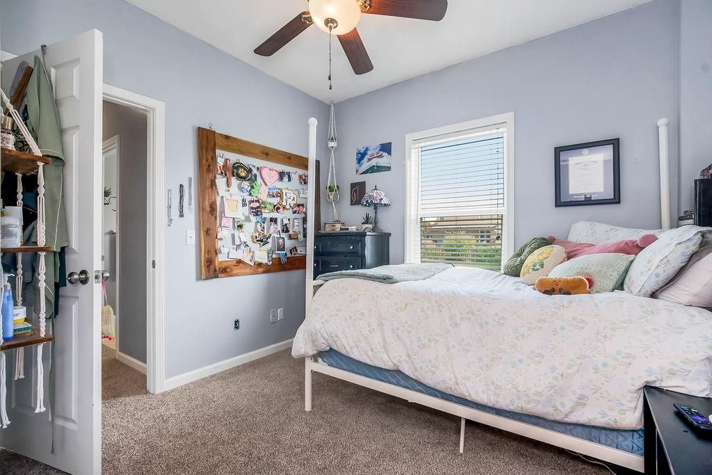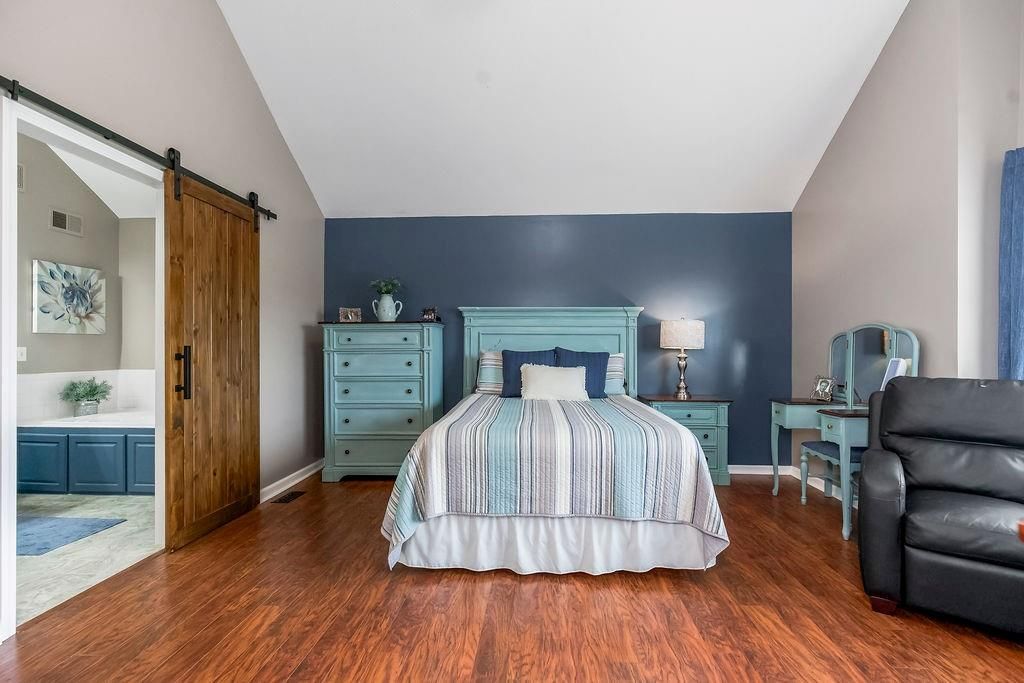 Welcome to your dream home with soaring ceilings and space to spare! Step inside to a grand, light-filled living room featuring a corner gas fireplace with a custom surround - perfect for cozy evenings. The open-concept kitchen and dining area is a chef's delight with granite countertops, pendant lighting, a spacious pantry, and ample cabinet storage. Just off the dining area, step out onto an amazing deck - ideal for morning coffee or summer barbecues. The vaulted primary suite is a true retreat, complete with a walk-in closet and spa-like bath featuring tiled floors, a jetted tub, and a tiled shower with 2 heads, 1 is a rain shower head! A stylish barn door adds just the right touch of charm! You'll love the fresh new carpet throughout, adding comfort and a move-in-ready feel. Head to the finished walkout lower level where you'll find a large family room perfect for movie nights or entertaining, plus a guest bedroom, a third full bath, and the 5th bedroom or bonus room - ideal for a home gym, office, or hobby space. Outside, enjoy the beautifully landscaped and fenced backyard from your covered patio with a ceiling fan to keep cool on warm summer nights. All of this, plus just a short walk to the neighborhood pool - this home has it all!