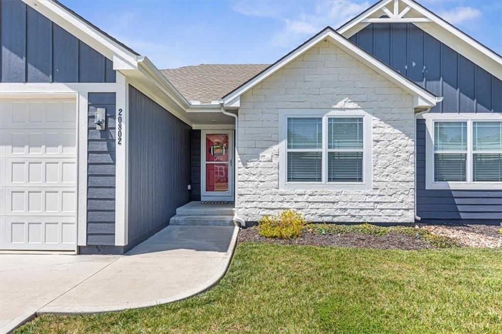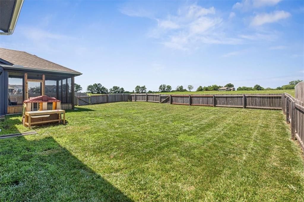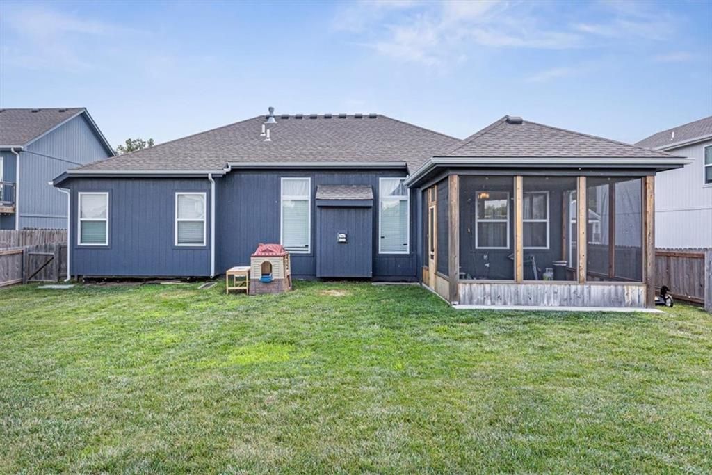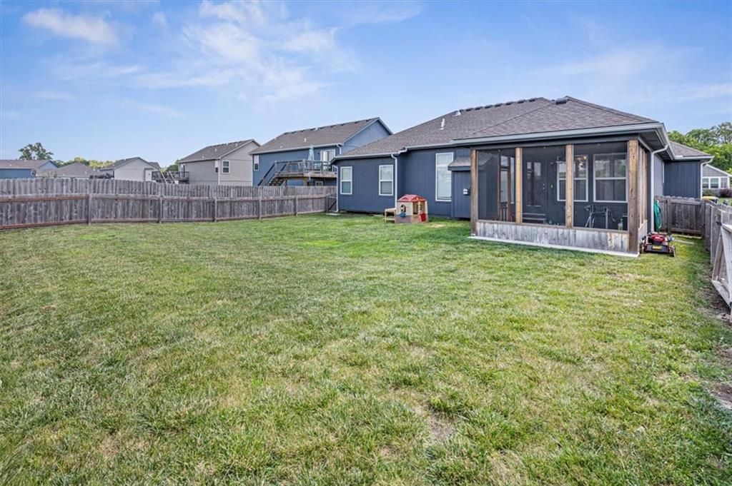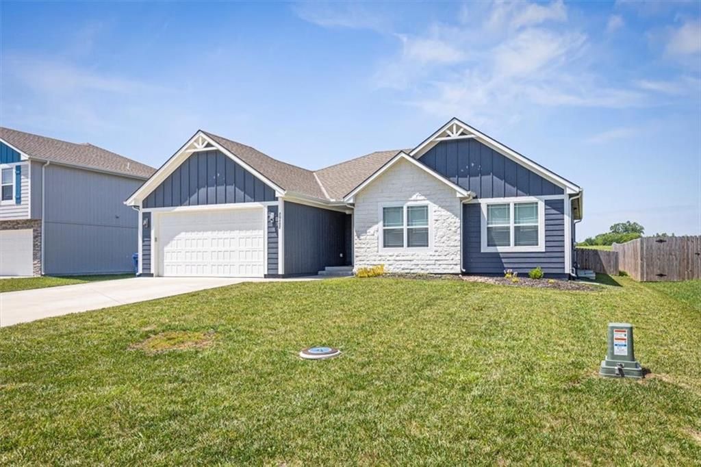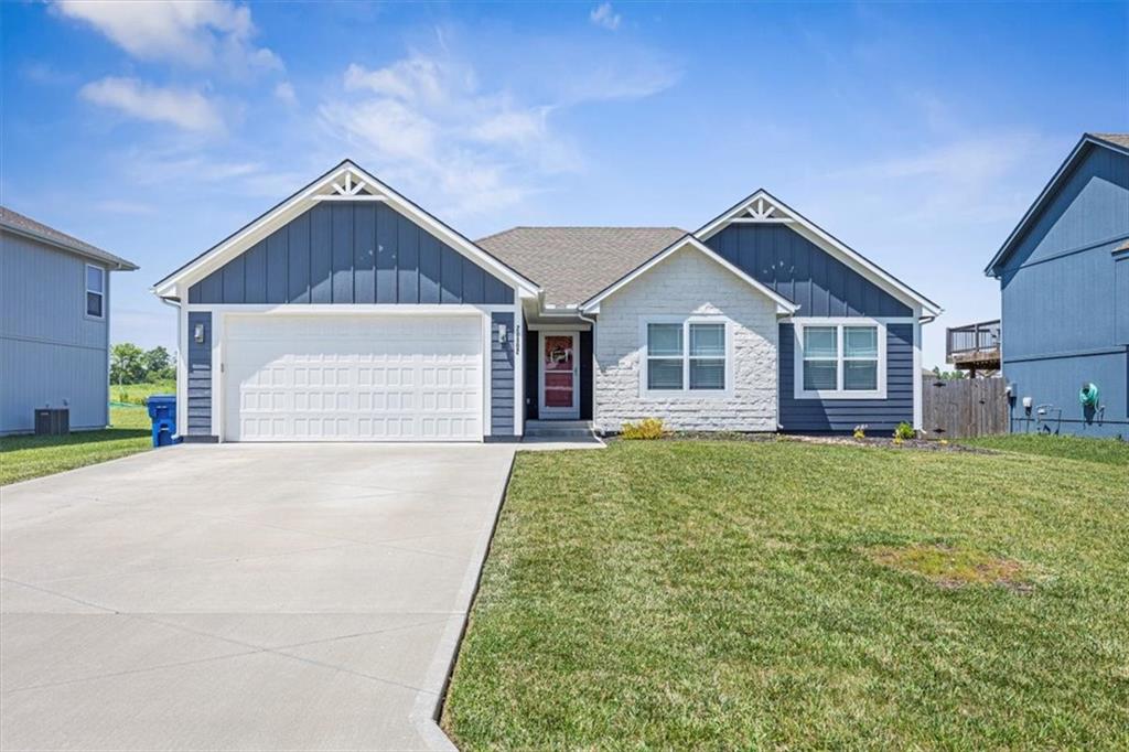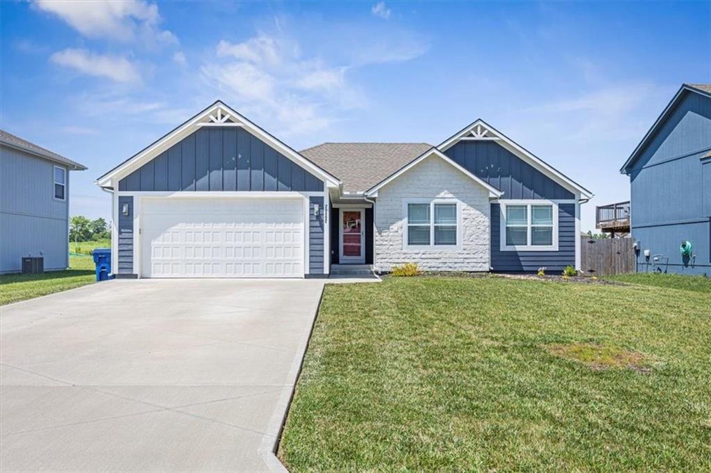 This beautifully designed ranch home in highly sought-after Copper Creek subdivision is ready for its new owners. Built in 2021, this 3 bedroom/2 bathroom home offers functionality and style. This spacious open concept main living area features vaulted ceilings, abundant natural light, a shiplap fireplace and main level laundry. The kitchen is extremely functional with custom soft closed kitchen cabinetry, granite countertops, large center island with seating, and a walk-in pantry. The full basement is stubbed for a bathroom and includes egress windows. It is ready to be finished with the option of adding two more conforming bedrooms, a rec room and/or office. Enjoy your morning or evening beverages on the covered screened in porch overlooking the fenced backyard. Additional highlights include a built-in mudroom area off the two-car garage. This home is situated within the award-winning Raymore- Peculiar School District and it is located just across the street.