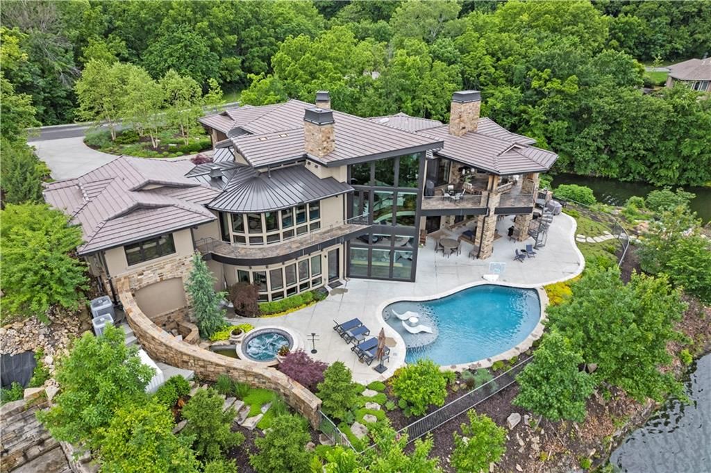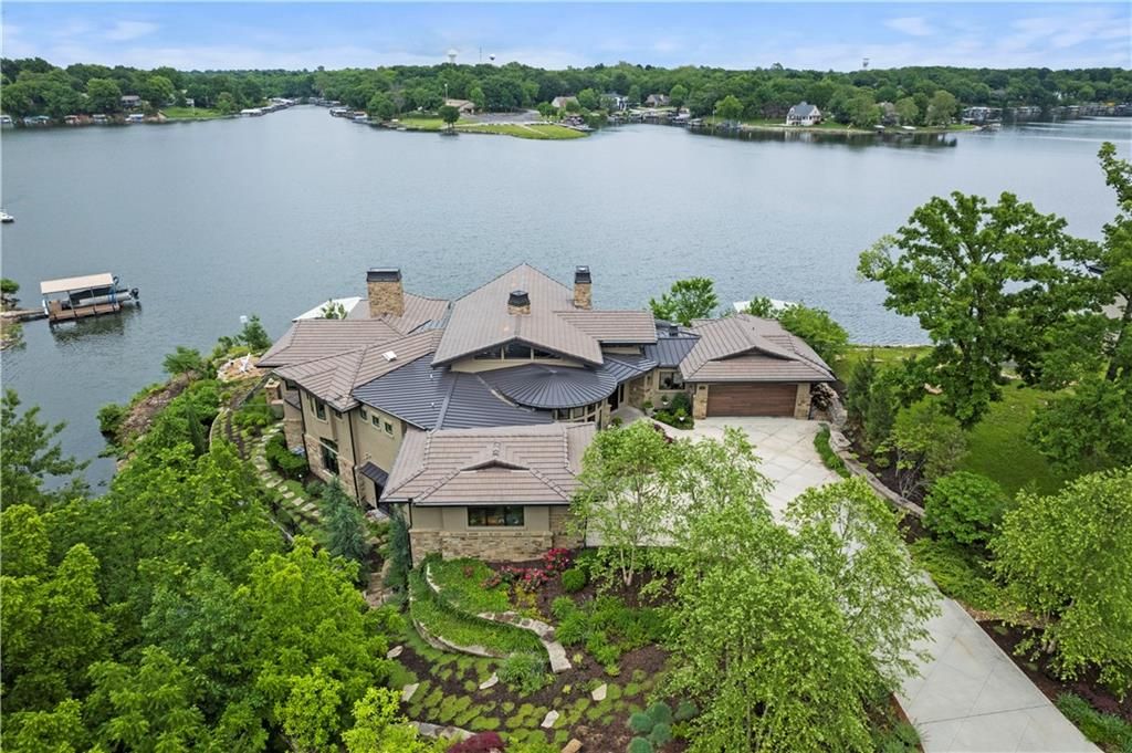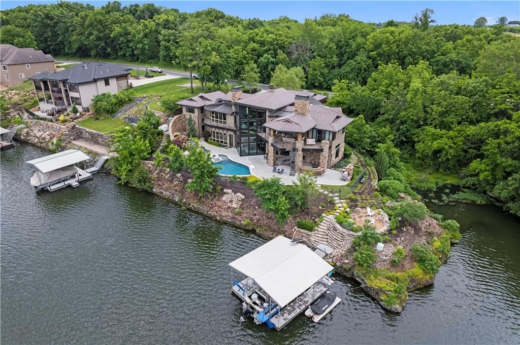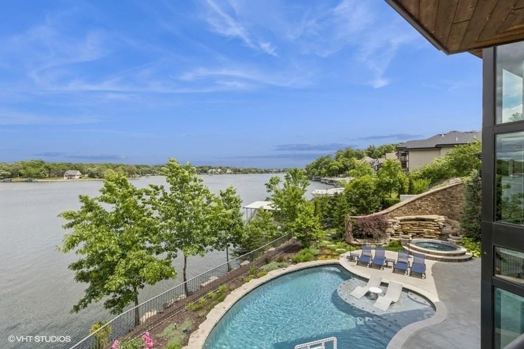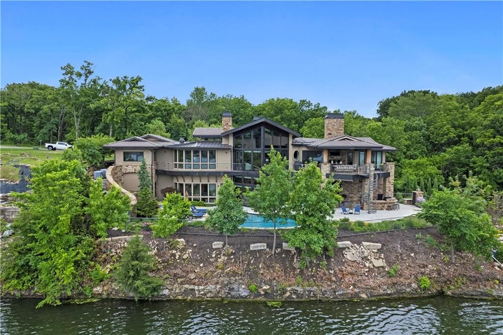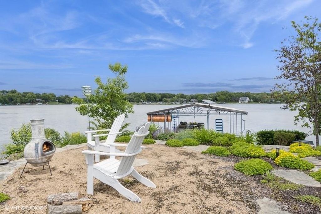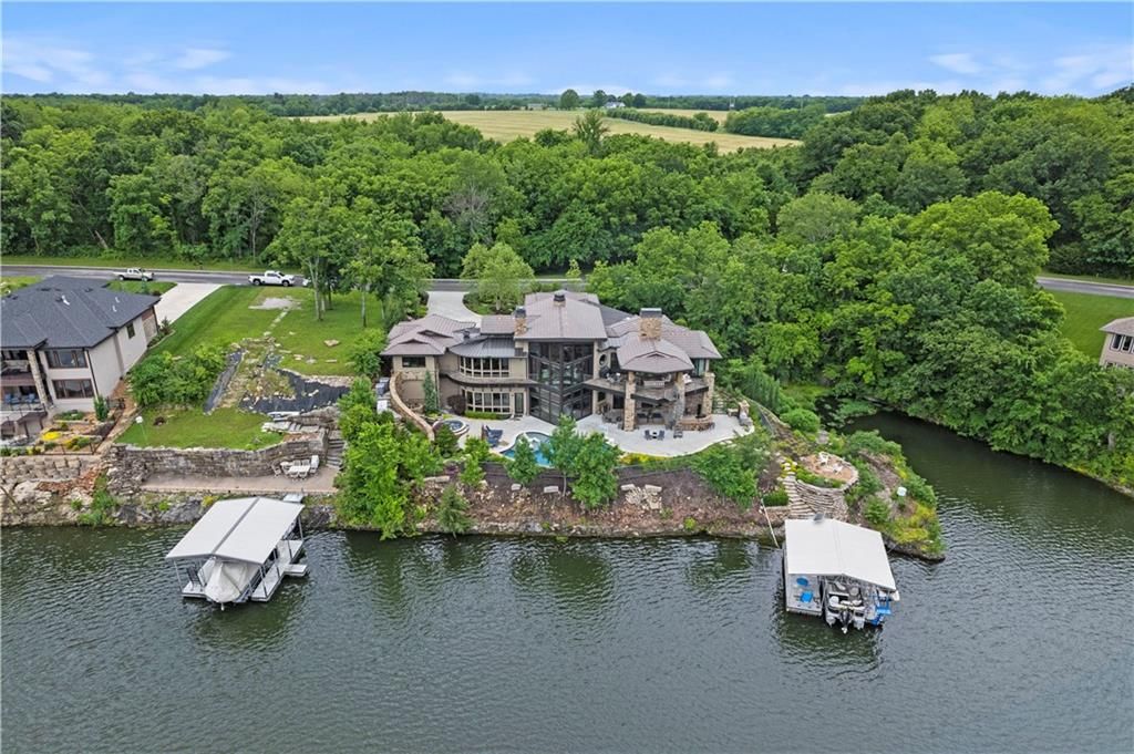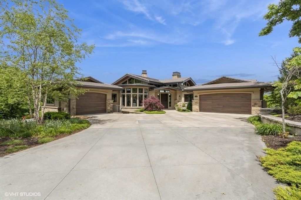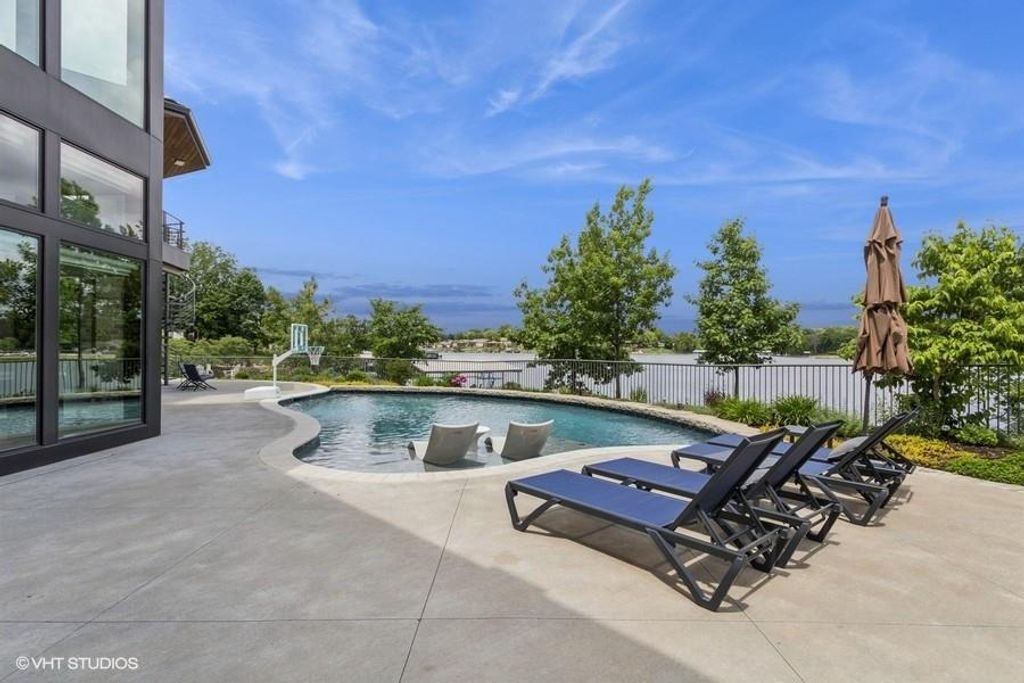 Nestled on over half an acre with more than 300 feet of pristine lake frontage, this custom-built estate offers unparalleled views and luxury in the exclusive Lake Winnebago community. Designed by renowned builder Bruce Rieke and completed in 2019, this home blends tropical Hawaiian inspirations with modern elegance, creating a serene retreat perfect for both relaxation and entertaining. Property Highlights: Spacious Living: Boasting 5,995 sq ft of finished living space across two levels, this reverse 1.5-story home features 3 bedrooms and 3.5 bathrooms and a 4th non conforming bunk bed room. Great Room: Soaring 22-foot ceilings and a wall of windows provide breathtaking lake views, complemented by a Brentwood stone hearth and a wood-burning fireplace. Gourmet Kitchen: Equipped with Wolf and SubZero appliances, a convection steam oven, quartz countertops, and a massive granite island, this kitchen is a chef's dream. Primary Suite: Enjoy 280-degree outdoor lake views, a spa-like bath with heated floors and Bain Ultra Chromatherapy, and a custom-designed California Closet. Entertainment Spaces: The lower level features a custom wood bar, media area with built-in bookshelves, two large bedrooms, and a hidden wine cellar with a tasting room. Outdoor Oasis: An in-ground pool with a Baja shelf, spa with a waterfall, solar-paneled dock with a lift, full outdoor kitchen, smoker, and a private stone breezeway entrance to the backyard. Additional Features: Elevator access, wide hallways and doorways for accessibility, a custom wood chute in the garage, and a generator. So much to see in this one of a kind lakefront home!