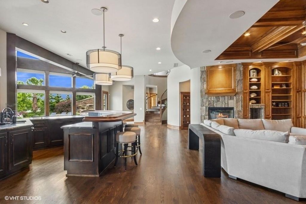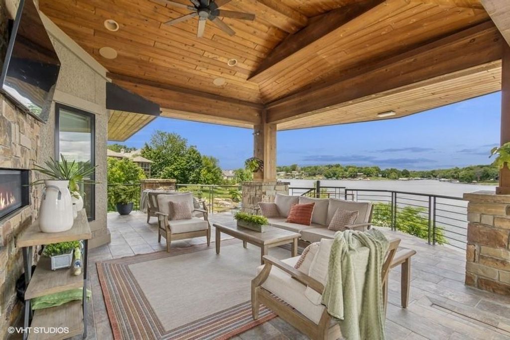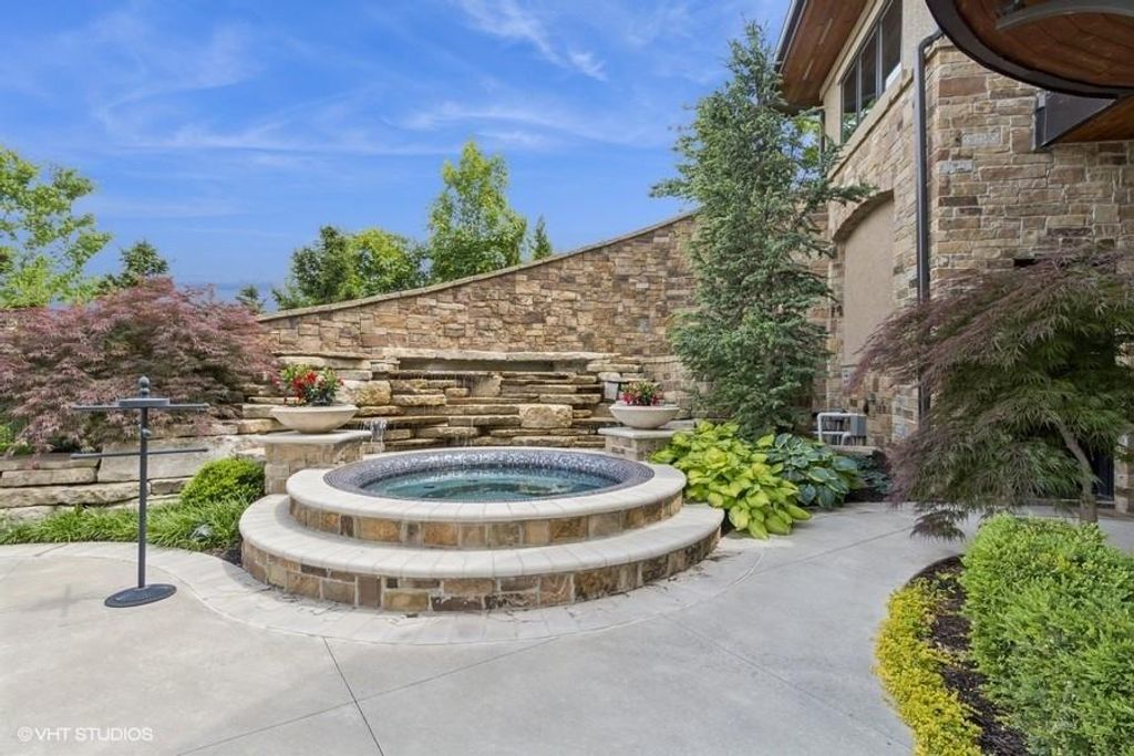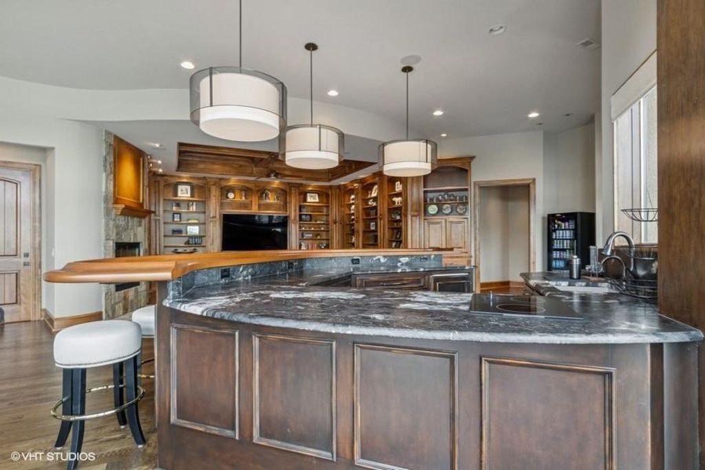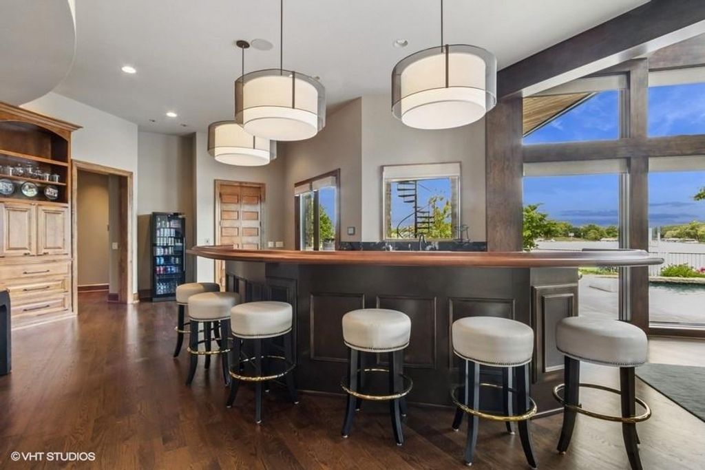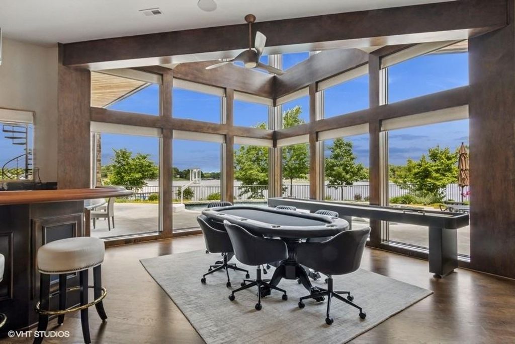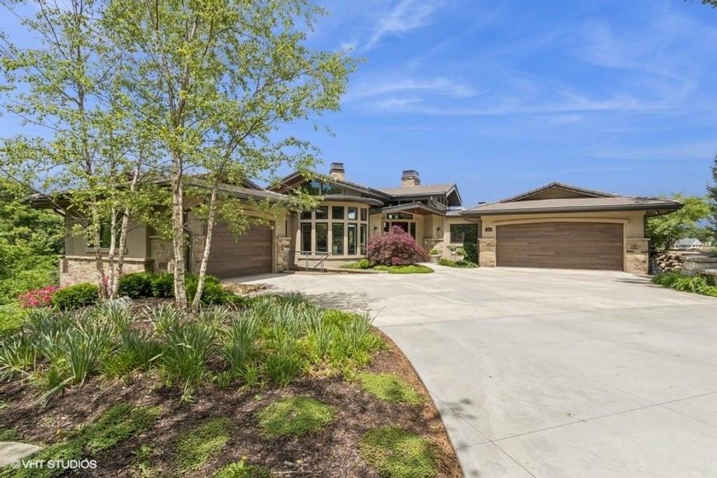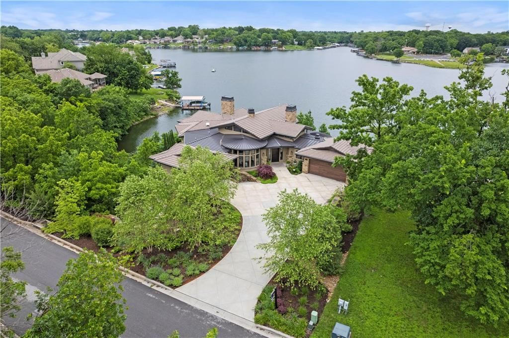 Nestled on over half an acre with more than 300 feet of pristine lake frontage, this custom-built estate offers unparalleled views and luxury in the exclusive Lake Winnebago community. Designed by renowned builder Bruce Rieke and completed in 2019, this home blends tropical Hawaiian inspirations with modern elegance, creating a serene retreat perfect for both relaxation and entertaining. Property Highlights: Spacious Living: Boasting 5,995 sq ft of finished living space across two levels, this reverse 1.5-story home features 3 bedrooms and 3.5 bathrooms and a 4th non conforming bunk bed room. Great Room: Soaring 22-foot ceilings and a wall of windows provide breathtaking lake views, complemented by a Brentwood stone hearth and a wood-burning fireplace. Gourmet Kitchen: Equipped with Wolf and SubZero appliances, a convection steam oven, quartz countertops, and a massive granite island, this kitchen is a chef's dream. Primary Suite: Enjoy 280-degree outdoor lake views, a spa-like bath with heated floors and Bain Ultra Chromatherapy, and a custom-designed California Closet. Entertainment Spaces: The lower level features a custom wood bar, media area with built-in bookshelves, two large bedrooms, and a hidden wine cellar with a tasting room. Outdoor Oasis: An in-ground pool with a Baja shelf, spa with a waterfall, solar-paneled dock with a lift, full outdoor kitchen, smoker, and a private stone breezeway entrance to the backyard. Additional Features: Elevator access, wide hallways and doorways for accessibility, a custom wood chute in the garage, and a generator. So much to see in this one of a kind lakefront home!