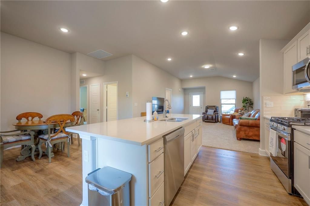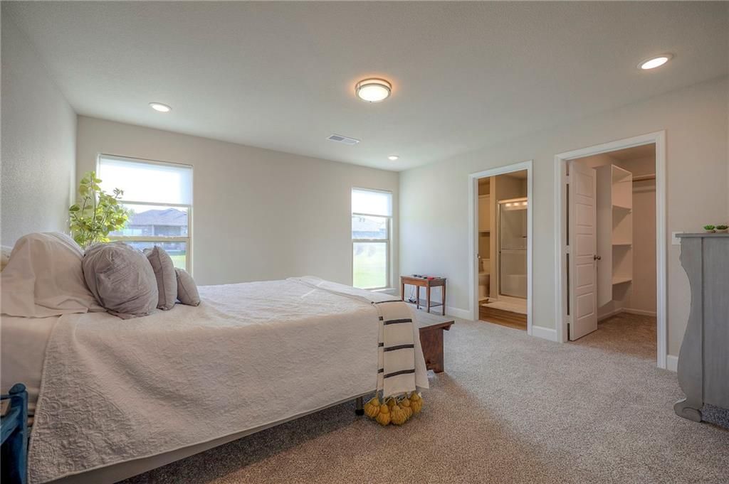 NEW STONE RIDGE DEVELOPMENT: VERY LIGHTLY lived in by single owner occupant since May 2025. Still has new home smell! Single Level Living in this All Brick, Wrapped Facia, and Vinyl Windows for a Low Maintenance Home in a New Construction Community. Exterior features covered front and back porches. Sodded lawn with sprinkler system. Open concept living offers spacious areas for gatherings. Appliances including W/D remain. Owner ensuite separate from other bedrooms. All the features of new construction homes, LVP, Kitchen Island, Pantry, Neutral color palette. Beautiful Cabinetry! No basement...No problem. Storm shelter access in garage under the garage floor for ultimate protection. Plenty of storage in this home. Quick closing and possession possible! BE HOME FOR THE HOLIDAYS! Fantastic De Soto Unified School District!