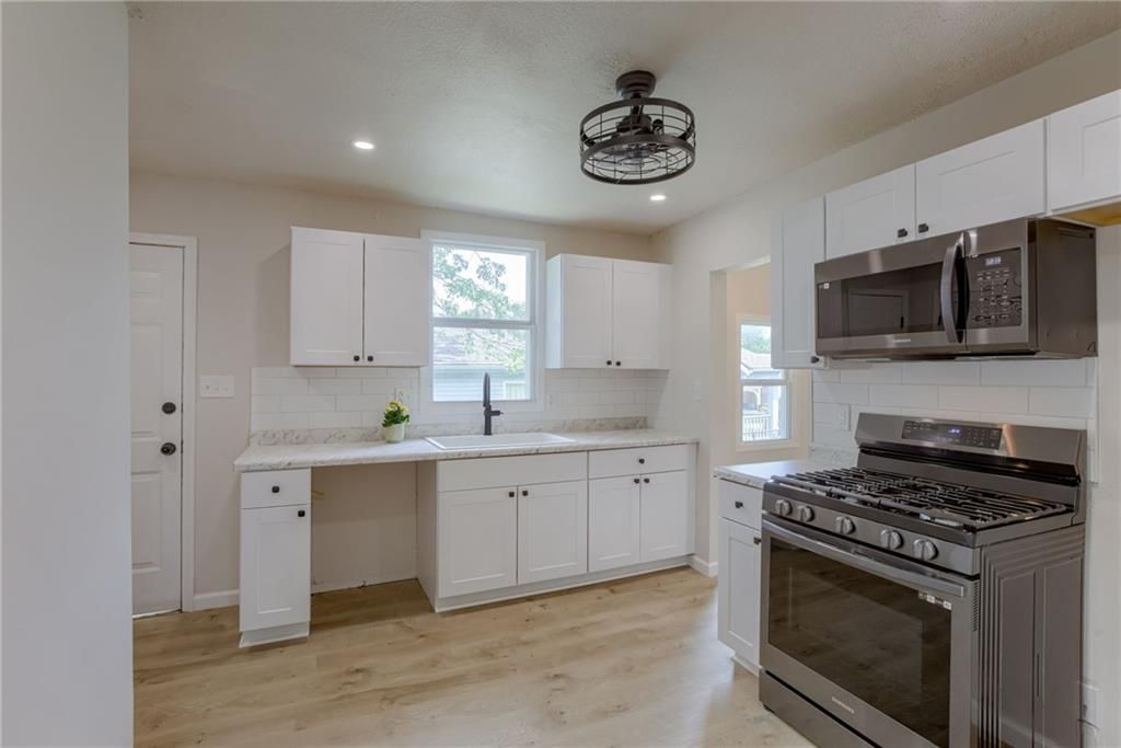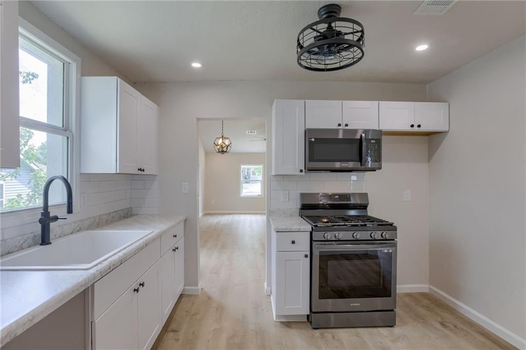 Stunning Fully Remodeled Bungalow - 3 Bed, 2 Bath with Modern Upgrades! Welcome to this completely remodeled 3-bedroom, 2-bathroom bungalow that blends timeless charm with sleek, modern updates. Thoughtfully renovated throughout, this home now features a vaulted ceiling in the living room, creating an open and airy feel from the moment you step inside. Enjoy cooking in the beautifully updated kitchen with new cabinets, countertops, recessed lighting, and a premium Samsung gas range with a matching microwave. Both bathrooms have been tastefully updated, including the newly added second bath for added convenience. Wide plank Mohawk Home flooring flows throughout the home, offering warmth and durability. A brand-new HVAC system and hot water heater ensures year-round comfort, while new siding on the front adds fresh curb appeal. Bonus - extra storage in the attic. - All work was permitted and done to code. Located in a quiet, established neighborhood within walking distance to a newly remodeled shopping center, this home offers peaceful living with easy access to local amenities. With its open feel, vaulted ceilings, and clean modern finishes throughout, this move-in-ready home is one you don't want to miss!